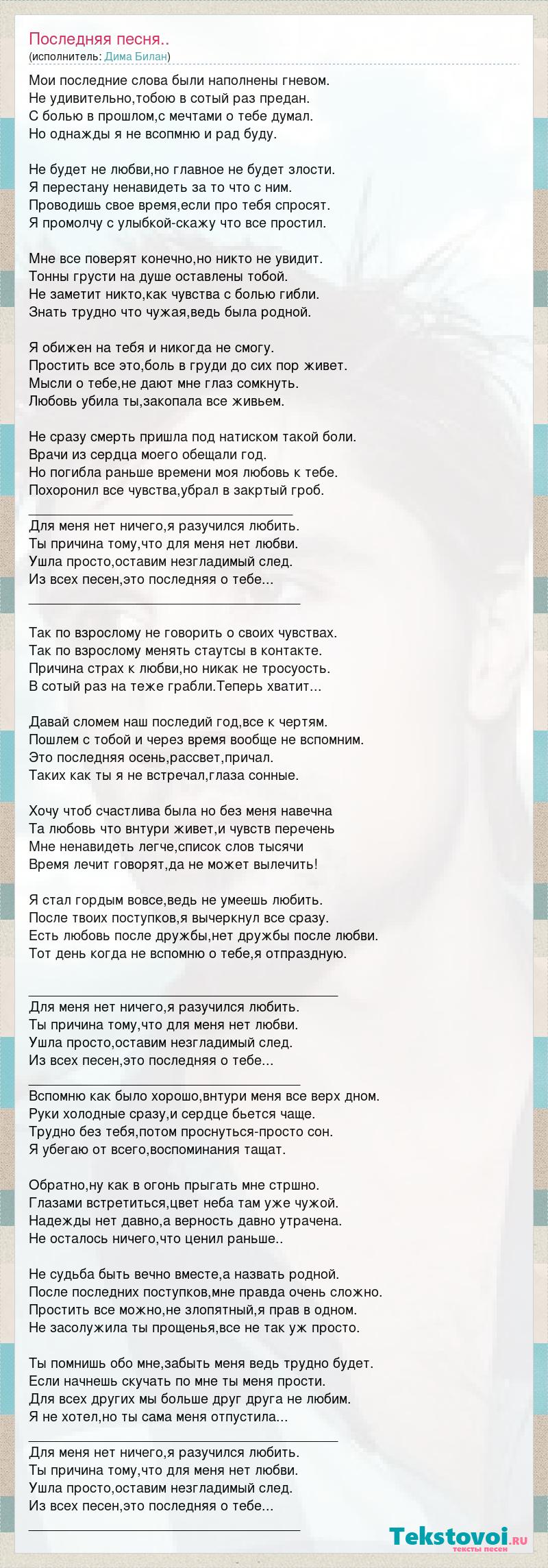 Мои последние слова были наполнены гневом. Не удивительно,тобою в сотый раз предан. С болью в прошлом,с мечтами о тебе думал. Но однажды я не всопмню и рад буду. Не будет не любви,но главное не будет злости. Я перестану ненавидеть за то что с ним. Проводишь свое время,если про тебя спросят. Я промолчу с улыбкой-скажу что все простил. Мне все поверят конечно,но никто не увидит. Тонны грусти на душе оставлены тобой. Не заметит никто,как чувства с болью гибли. Знать трудно что чужая,ведь была родной. Я обижен на тебя и никогда не смогу. Простить все это,боль в груди до сих пор живет. Мысли о тебе,не дают мне глаз сомкнуть. Любовь убила ты,закопала все живьем. Не сразу смерть пришла под натиском такой боли. Врачи из сердца моего обещали год. Но погибла раньше времени моя любовь к тебе. Похоронил все чувства,убрал в закртый гроб. ___________________________________ Для меня нет ничего,я разучился любить. Ты причина тому,что для меня нет любви. Ушла просто,оставим незгладимый след. Из всех песен,это последняя о тебе... ____________________________________ Так по взрослому не говорить о своих чувствах. Так по взрослому менять стаутсы в контакте. Причина страх к любви,но никак не тросуость. В сотый раз на теже грабли.Теперь хватит... Давай сломем наш последий год,все к чертям. Пошлем с тобой и через время вообще не вспомним. Это последняя осень,рассвет,причал. Таких как ты я не встречал,глаза сонные. Хочу чтоб счастлива была но без меня навечна Та любовь что внтури живет,и чувств перечень Мне ненавидеть легче,список слов тысячи Время лечит говорят,да не может вылечить! Я стал гордым вовсе,ведь не умеешь любить. После твоих поступков,я вычеркнул все сразу. Есть любовь после дружбы,нет дружбы после любви. Тот день когда не вспомню о тебе,я отпраздную. _________________________________________ Для меня нет ничего,я разучился любить. Ты причина тому,что для меня нет любви. Ушла просто,оставим незгладимый след. Из всех песен,это последняя о тебе... ____________________________________ Вспомню как было хорошо,внтури меня все верх дном. Руки холодные сразу,и сердце бьется чаще. Трудно без тебя,потом проснуться-просто сон. Я убегаю от всего,воспоминания тащат. Обратно,ну как в огонь прыгать мне стршно. Глазами встретиться,цвет неба там уже чужой. Надежды нет давно,а верность давно утрачена. Не осталось ничего,что ценил раньше.. Не судьба быть вечно вместе,а назвать родной. После последних поступков,мне правда очень сложно. Простить все можно,не злопятный,я прав в одном. Не засолужила ты прощенья,все не так уж просто. Ты помнишь обо мне,забыть меня ведь трудно будет. Если начнешь скучать по мне ты меня прости. Для всех других мы больше друг друга не любим. Я не хотел,но ты сама меня отпустила... _________________________________________ Для меня нет ничего,я разучился любить. Ты причина тому,что для меня нет любви. Ушла просто,оставим незгладимый след. Из всех песен,это последняя о тебе... ____________________________________