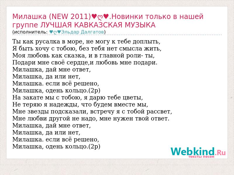 Ты как русалка в море, не могу к тебе доплыть, Я быть хочу с тобою, без тебя нет смысла жить, Моя любовь как сказка, и в главной роли- ты, Подари мне своё сердце,и любовь мне подари. Милашка, дай мне ответ, Милашка, да или нет, Милашка. если всё решено, Милашка, одень кольцо.(2р) На закате мы с тобою, я дарю тебе цветы, Не теряю я надежды, что будем вместе мы, Мне звезды подсказали, встречу я с тобой рассвет, Мне любви другой не надо, мне нужен твой ответ. Милашка, дай мне ответ, Милашка, да или нет, Милашка. если всё решено, Милашка, одень кольцо.(2р)