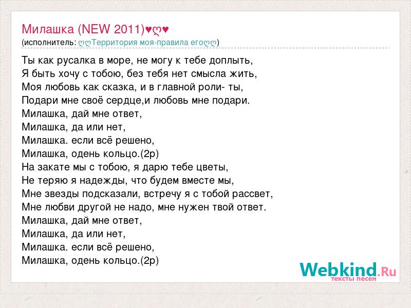 Ты как русалка в море, не могу к тебе доплыть, Я быть хочу с тобою, без тебя нет смысла жить, Моя любовь как сказка, и в главной роли- ты, Подари мне своё сердце,и любовь мне подари. Милашка, дай мне ответ, Милашка, да или нет, Милашка. если всё решено, Милашка, одень кольцо.(2р) На закате мы с тобою, я дарю тебе цветы, Не теряю я надежды, что будем вместе мы, Мне звезды подсказали, встречу я с тобой рассвет, Мне любви другой не надо, мне нужен твой ответ. Милашка, дай мне ответ, Милашка, да или нет, Милашка. если всё решено, Милашка, одень кольцо.(2р)