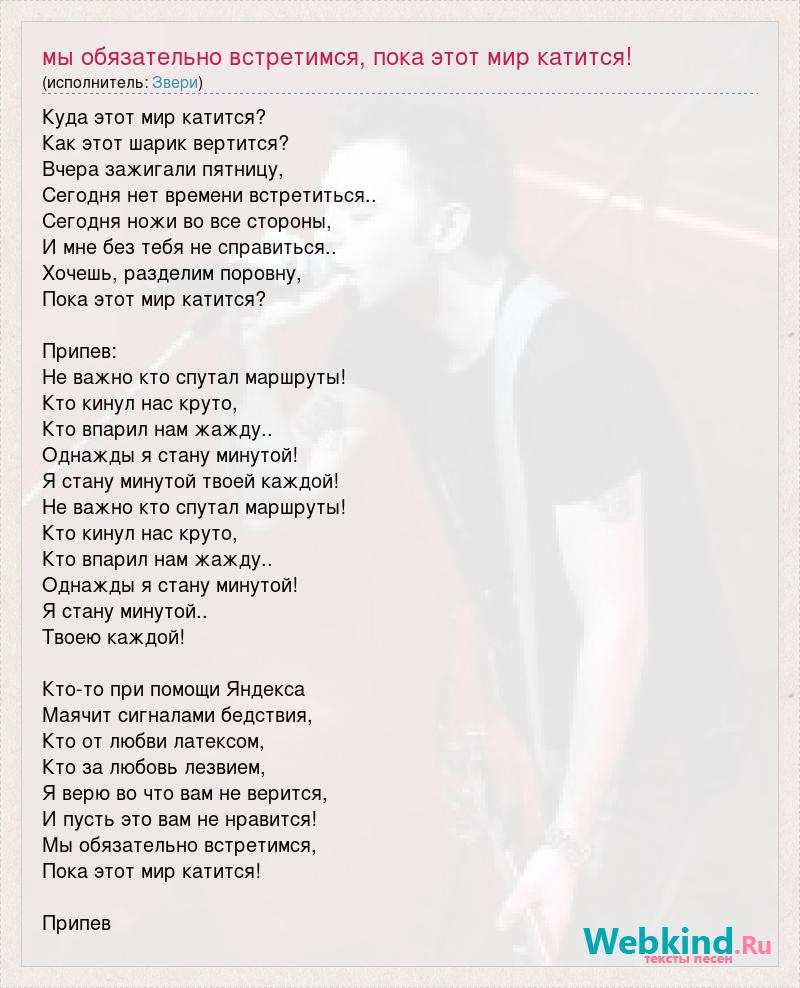 Куда этот мир катится? Как этот шарик вертится? Вчера зажигали пятницу, Сегодня нет времени встретиться.. Сегодня ножи во все стороны, И мне без тебя не справиться.. Хочешь, разделим поровну, Пока этот мир катится? Припев: Не важно кто спутал маршруты! Кто кинул нас круто, Кто впарил нам жажду.. Однажды я стану минутой! Я стану минутой твоей каждой! Не важно кто спутал маршруты! Кто кинул нас круто, Кто впарил нам жажду.. Однажды я стану минутой! Я стану минутой.. Твоею каждой! Кто-то при помощи Яндекса Маячит сигналами бедствия, Кто от любви латексом, Кто за любовь лезвием, Я верю во что вам не верится, И пусть это вам не нравится! Мы обязательно встретимся, Пока этот мир катится! Припев