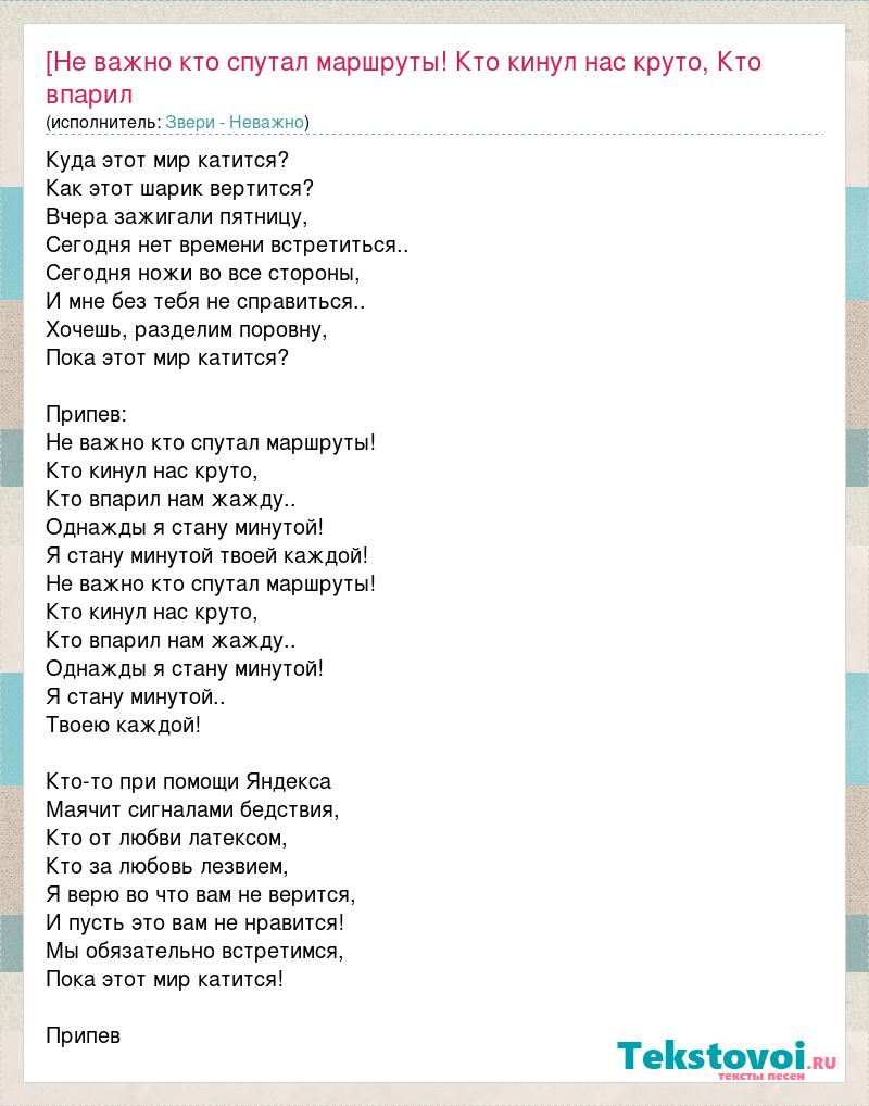 Куда этот мир катится? Как этот шарик вертится? Вчера зажигали пятницу, Сегодня нет времени встретиться.. Сегодня ножи во все стороны, И мне без тебя не справиться.. Хочешь, разделим поровну, Пока этот мир катится? Припев: Не важно кто спутал маршруты! Кто кинул нас круто, Кто впарил нам жажду.. Однажды я стану минутой! Я стану минутой твоей каждой! Не важно кто спутал маршруты! Кто кинул нас круто, Кто впарил нам жажду.. Однажды я стану минутой! Я стану минутой.. Твоею каждой! Кто-то при помощи Яндекса Маячит сигналами бедствия, Кто от любви латексом, Кто за любовь лезвием, Я верю во что вам не верится, И пусть это вам не нравится! Мы обязательно встретимся, Пока этот мир катится! Припев