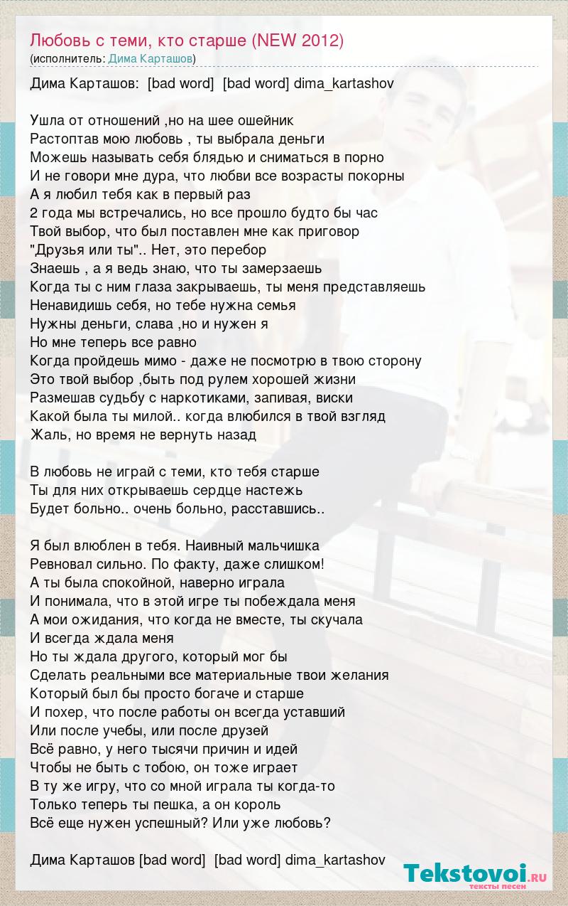 Дима Карташов: [bad word] [bad word] dima_kartashov Ушла от отношений ,но на шее ошейник Растоптав мою любовь , ты выбрала деньги Можешь называть себя блядью и сниматься в порно И не говори мне дура, что любви все возрасты покорны А я любил тебя как в первый раз 2 года мы встречались, но все прошло будто бы час Твой выбор, что был поставлен мне как приговор "Друзья или ты".. Нет, это перебор Знаешь , а я ведь знаю, что ты замерзаешь Когда ты с ним глаза закрываешь, ты меня представляешь Ненавидишь себя, но тебе нужна семья Нужны деньги, слава ,но и нужен я Но мне теперь все равно Когда пройдешь мимо - даже не посмотрю в твою сторону Это твой выбор ,быть под рулем хорошей жизни Размешав судьбу с наркотиками, запивая, виски Какой была ты милой.. когда влюбился в твой взгляд Жаль, но время не вернуть назад В любовь не играй с теми, кто тебя старше Ты для них открываешь сердце настежь Будет больно.. очень больно, расставшись.. Я был влюблен в тебя. Наивный мальчишка Ревновал сильно. По факту, даже слишком! А ты была спокойной, наверно играла И понимала, что в этой игре ты побеждала меня А мои ожидания, что когда не вместе, ты скучала И всегда ждала меня Но ты ждала другого, который мог бы Сделать реальными все материальные твои желания Который был бы просто богаче и старше И похер, что после работы он всегда уставший Или после учебы, или после друзей Всё равно, у него тысячи причин и идей Чтобы не быть с тобою, он тоже играет В ту же игру, что со мной играла ты когда-то Только теперь ты пешка, а он король Всё еще нужен успешный? Или уже любовь? Дима Карташов [bad word] [bad word] dima_kartashov
