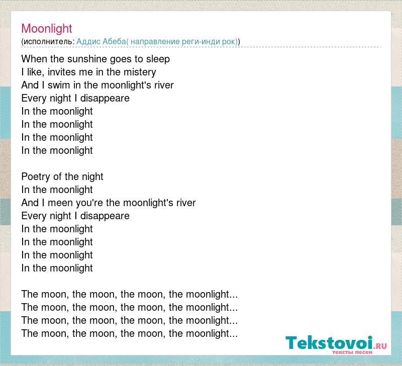 When the sunshine goes to sleep I like, invites me in the mistery And I swim in the moonlight's river Every night I disappeare In the moonlight In the moonlight In the moonlight In the moonlight Poetry of the night In the moonlight And I meen you're the moonlight's river Every night I disappeare In the moonlight In the moonlight In the moonlight In the moonlight The moon, the moon, the moon, the moonlight... The moon, the moon, the moon, the moonlight... The moon, the moon, the moon, the moonlight... The moon, the moon, the moon, the moonlight...