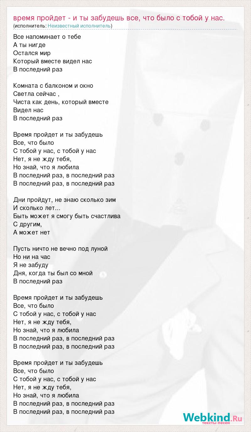 Главная→Исполнители→Неизвестный Исполнитель→Время пройдет - и ты забудешь все, что было с тобой у нас. Нет, я
