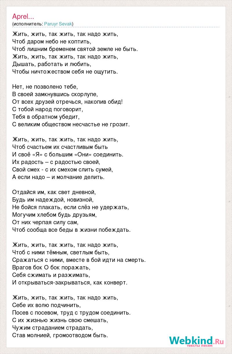 Жить, жить, так жить, так надо жить, Чтоб даром небо не коптить, Чтоб лишним бременем святой земле не быть. Жить, жить, так жить, так надо жить, Дышать, работать и любить, Чтобы ничтожеством себя не ощутить. Нет, не позволено тебе, В своей замкнувшись скорлупе, От всех друзей отречься, накопив обид! С тобой народ поговорит, Тебя в обратном убедит, С великим обществом несчастье не грозит. Жить, жить, так жить, так надо жить, Чтоб счастьем их счастливым быть И своё «Я» с большим «Они» соединить. Их радость – с радостью своей, Свой смех - с их смехом слить сумей, А если надо – и молчание делить. Отдайся им, как свет дневной, Будь им надеждой, новизной, Не бойся плакать, если слёз не удержать, Могучим хлебом будь друзьям, От них черпая силу сам, Чтоб сообща все беды в жизни побеждать. Жить, жить, так жить, так надо жить, Чтоб с ними тёмным, светлым быть, Сражаться с ними, вместе в бой идти на смерть. Врагов бок О бок поражать, Себя сжимать и разжимать, И открываться-закрываться, как конверт. Жить, жить, так жить, так надо жить, Себе их волю подчинить, Посев с посевом, труд с трудом соединить. С их жизнью жизнь свою смешать, Чужим страданием страдать, Став молнией, громоотводом быть.