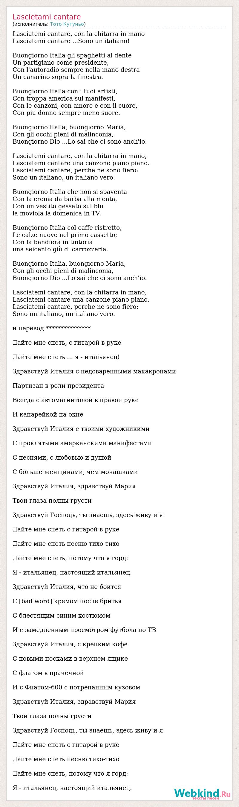 Lasciatemi cantare, con la chitarra in mano Lasciatemi cantare ...Sono un italiano! Buongiorno Italia gli spaghetti al dente Un partigiano come presidente, Con l'autoradio sempre nella mano destra Un canarino sopra la finestra. Buongiorno Italia con i tuoi artisti, Con troppa america sui manifesti, Con le canzoni, con amore e con il cuore, Con piu donne sempre meno suore. Buongiorno Italia, buongiorno Maria, Con gli occhi pieni di malinconia, Buongiorno Dio ...Lo sai che ci sono anch'io. Lasciatemi cantare, con la chitarra in mano, Lasciatemi cantare una canzone piano piano. Lasciatemi cantare, perche ne sono fiero: Sono un italiano, un italiano vero. Buongiorno Italia che non si spaventa Con la crema da barba alla menta, Con un vestito gessato sul blu la moviola la domenica in TV. Buongiorno Italia col caffe ristretto, Le calze nuove nel primo cassetto; Con la bandiera in tintoria una seicento giù di carrozzeria. Buongiorno Italia, buongiorno Maria, Con gli occhi pieni di malinconia, Buongiorno Dio ...Lo sai che ci sono anch'io. Lasciatemi cantare, con la chitarra in mano, Lasciatemi cantare una canzone piano piano. Lasciatemi cantare, perche ne sono fiero: Sono un italiano, un italiano vero. и перевод *************** Дайте мне спеть, с гитарой в руке Дайте мне спеть … я - итальянец! Здравствуй Италия с недоваренными макакронами Партизан в роли президента Всегда с автомагнитолой в правой руке И канарейкой на окне Здравствуй Италия с твоими художникими С проклятыми амерканскими манифестами С песнями, с любовью и душой С больше женщинами, чем монашками Здравствуй Италия, здравствуй Мария Твои глаза полны грусти Здравствуй Господь, ты знаешь, здесь живу и я Дайте мне спеть с гитарой в руке Дайте мне спеть песню тихо-тихо Дайте мне спеть, потому что я горд: Я - итальянец, настоящий итальянец. Здравствуй Италия, что не боится С [bad word] кремом после бритья С блестящим синим костюмом И с замедленным просмотром футбола по ТВ Здравствуй Италия, с крепким кофе С новыми носками в верхнем ящике С флагом в прачечной И с Фиатом-600 с потрепанным кузовом Здравствуй Италия, здравствуй Мария Твои глаза полны грусти Здравствуй Господь, ты знаешь, здесь живу и я Дайте мне спеть с гитарой в руке Дайте мне спеть песню тихо-тихо Дайте мне спеть, потому что я горд: Я - итальянец, настоящий итальянец.