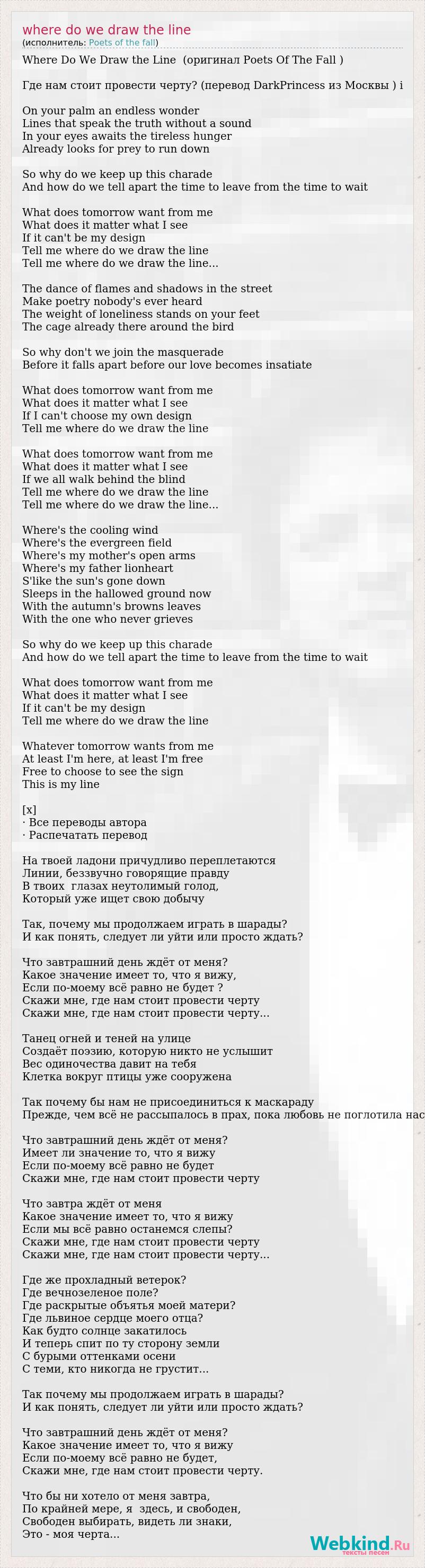 Where Do We Draw the Line (оригинал Poets Of The Fall ) Где нам стоит провести черту? (перевод DarkPrincess из Москвы ) i On your palm an endless wonder Lines that speak the truth without a sound In your eyes awaits the tireless hunger Already looks for prey to run down So why do we keep up this charade And how do we tell apart the time to leave from the time to wait What does tomorrow want from me What does it matter what I see If it can't be my design Tell me where do we draw the line Tell me where do we draw the line... The dance of flames and shadows in the street Make poetry nobody's ever heard The weight of loneliness stands on your feet The cage already there around the bird So why don't we join the masquerade Before it falls apart before our love becomes insatiate What does tomorrow want from me What does it matter what I see If I can't choose my own design Tell me where do we draw the line What does tomorrow want from me What does it matter what I see If we all walk behind the blind Tell me where do we draw the line Tell me where do we draw the line... Where's the cooling wind Where's the evergreen field Where's my mother's open arms Where's my father lionheart S'like the sun's gone down Sleeps in the hallowed ground now With the autumn's browns leaves With the one who never grieves So why do we keep up this charade And how do we tell apart the time to leave from the time to wait What does tomorrow want from me What does it matter what I see If it can't be my design Tell me where do we draw the line Whatever tomorrow wants from me At least I'm here, at least I'm free Free to choose to see the sign This is my line [x] · Все переводы автора · Распечатать перевод На твоей ладони причудливо переплетаются Линии, беззвучно говорящие правду В твоих глазах неутолимый голод, Который уже ищет свою добычу Так, почему мы продолжаем играть в шарады? И как понять, следует ли уйти или просто ждать? Что завтрашний день ждёт от меня? Какое значение имеет то, что я вижу, Если по-моему всё равно не будет ? Скажи мне, где нам стоит провести черту Скажи мне, где нам стоит провести черту... Танец огней и теней на улице Создаёт поэзию, которую никто не услышит Вес одиночества давит на тебя Клетка вокруг птицы уже сооружена Так почему бы нам не присоединиться к маскараду Прежде, чем всё не рассыпалось в прах, пока любовь не поглотила нас Что завтрашний день ждёт от меня? Имеет ли значение то, что я вижу Если по-моему всё равно не будет Скажи мне, где нам стоит провести черту Что завтра ждёт от меня Какое значение имеет то, что я вижу Если мы всё равно останемся слепы? Скажи мне, где нам стоит провести черту Скажи мне, где нам стоит провести черту... Где же прохладный ветерок? Где вечнозеленое поле? Где раскрытые объятья моей матери? Где львиное сердце моего отца? Как будто солнце закатилось И теперь спит по ту сторону земли С бурыми оттенками осени С теми, кто никогда не грустит... Так почему мы продолжаем играть в шарады? И как понять, следует ли уйти или просто ждать? Что завтрашний день ждёт от меня? Какое значение имеет то, что я вижу Если по-моему всё равно не будет, Скажи мне, где нам стоит провести черту. Что бы ни хотело от меня завтра, По крайней мере, я здесь, и свободен, Свободен выбирать, видеть ли знаки, Это - моя черта...
