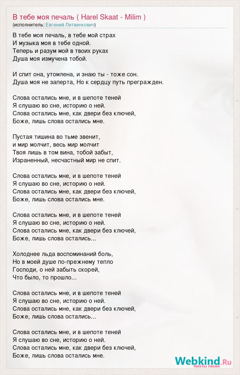 В тебе моя печаль, в тебе мой страх И музыка моя в тебе одной. Теперь и разум мой в твоих руках Душа моя измучена тобой. И спит она, утомлена, и знаю ты - тоже сон. Душа моя не заперта, Но к сердцу путь прегражден. Слова остались мне, и в шепоте теней Я слушаю во сне, историю о ней. Слова остались мне, как двери без ключей, Боже, лишь слова остались мне. Пустая тишина во тьме звенит, и мир молчит, весь мир молчит Твоя лишь в том вина, тобой забыт, Израненный, несчастный мир не спит. Слова остались мне, и в шепоте теней Я слушаю во сне, историю о ней. Слова остались мне, как двери без ключей, Боже, лишь слова остались мне. Слова остались мне, и в шепоте теней Я слушаю во сне, историю о ней. Слова остались мне, как двери без ключей, Боже, лишь слова остались... Холоднее льда воспоминаний боль, Но в моей душе по-прежнему тепло Господи, о ней забыть скорей, Что было, то прошло... Слова остались мне, и в шепоте теней Я слушаю во сне, историю о ней. Слова остались мне, как двери без ключей, Боже, лишь слова остались... Слова остались мне, и в шепоте теней Я слушаю во сне, историю о ней. Слова остались мне, как двери без ключей, Боже, лишь слова остались мне.