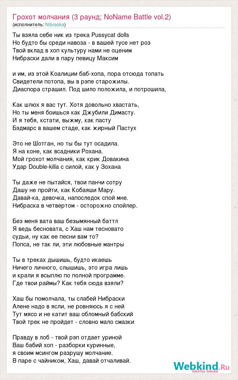 Ты взяла себе ник из трека Pussycat dolls Но будто бы среди навоза - в вашей тусе нет роз Твой вклад в хоп культуру нами не оценим Нибраски дали в пару певицу Максим и им, из этой Коалиции баб-хопа, пора отсюда топать Свидетели потопа, вы в рэпе старожилы. Диаспора страшил. Под шило положила, и потрошила, Как шлюх я вас тут. Хотя довольно хвастать, Но ты меня боишься как Джубили Димасту. И я тебя, кстати, выжму, как пасту Бэдмарс в вашем стаде, как жирный Пастух Это не Шотган, но ты бы тут осадила. Я на коне, как всадники Рохана. Мой грохот молчания, как крик Довакина Удар Double-killа с силой, как у Зохана Ты даже не пытайся, твои панчи сотру Дашу не пройти, как Кобаяши Мару. Давай-ка, девочка, напоследок спой мне. Нибраска в четвертом - осторожно спойлер. Без меня вата ваш безымянный баттл Я ведь бесновата, с Хаш нам тесновато судьи, ну как ее песни вам то? Попса, не так ли, эти любовные мантры Ты в треках дышишь, будто икаешь Ничего личного, слышишь, это игра лишь и крали я всыплю по полной программе. Где твои раймы? Как тебя сюда взяли? Хаш бы помолчала, ты слабей Нибраски Алене надо в ясли, не ровняюсь я с ней Тут мясо и не катит ваш обломный бабский Твой трек не пройдет - словно мало смазки Правду в лоб - твой рэп отдает уриной Ваш бабий хоп - разборки куринные, я своим мсингом разрушу молчание. В паре с чайником, Хаш, давай отчаливай.