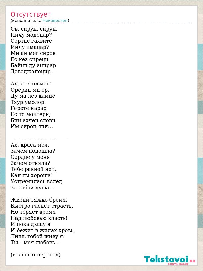 Ов, сирун, сирун, Инчу модецар? Сертис гахвите Инчу имацар? Ми ан мег сиров Ес кез сиреци, Байнц ду анирар Даваджанецир… Ах, ете тесмен! Орериц ми ор, Ду ма лез камис Тхур умолор. Герете нарар Ес то мочтери, Бин ахчен слови Им сироц яни… ----------------------------------- Ах, краса моя, Зачем подошла? Сердце у меня Зачем отняла? Тебе равной нет, Как ты хороша! Устремилась вслед За тобой душа… Жизни тяжко бремя, Быстро гаснет страсть, Но теряет время Над любовью власть! И пока дышу я И бежит в жилах кровь, Лишь тобой живу я: Ты – моя любовь… (вольный перевод)
