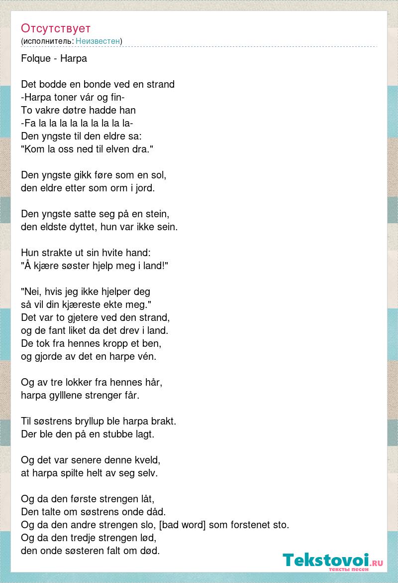 Folque - Harpa Det bodde en bonde ved en strand -Harpa toner vár og fin- To vakre døtre hadde han -Fa la la la la la la la la la- Den yngste til den eldre sa: "Kom la oss ned til elven dra." Den yngste gikk føre som en sol, den eldre etter som orm i jord. Den yngste satte seg på en stein, den eldste dyttet, hun var ikke sein. Hun strakte ut sin hvite hand: "Å kjære søster hjelp meg i land!" "Nei, hvis jeg ikke hjelper deg så vil din kjæreste ekte meg." Det var to gjetere ved den strand, og de fant liket da det drev i land. De tok fra hennes kropp et ben, og gjorde av det en harpe vén. Og av tre lokker fra hennes hår, harpa gylllene strenger får. Til søstrens bryllup ble harpa brakt. Der ble den på en stubbe lagt. Og det var senere denne kveld, at harpa spilte helt av seg selv. Og da den første strengen låt, Den talte om søstrens onde dåd. Og da den andre strengen slo, bruden som forstenet sto. Og da den tredje strengen lød, den onde søsteren falt om død.
