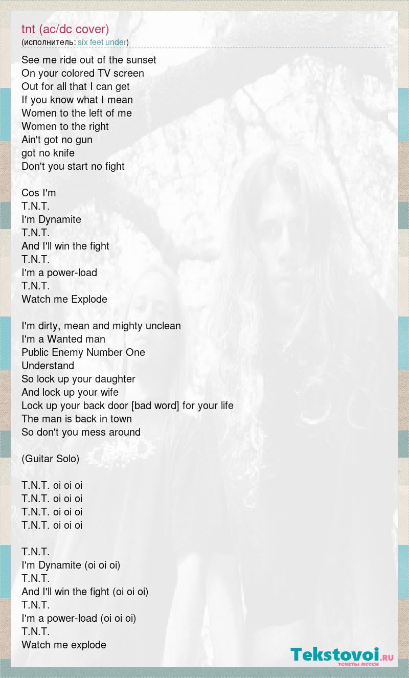 See me ride out of the sunset On your colored TV screen Out for all that I can get If you know what I mean Women to the left of me Women to the right Ain't got no gun got no knife Don't you start no fight Cos I'm T.N.T. I'm Dynamite T.N.T. And I'll win the fight T.N.T. I'm a power-load T.N.T. Watch me Explode I'm dirty, mean and mighty unclean I'm a Wanted man Public Enemy Number One Understand So lock up your daughter And lock up your wife Lock up your back door And run for your life The man is back in town So don't you mess around (Guitar Solo) T.N.T. oi oi oi T.N.T. oi oi oi T.N.T. oi oi oi T.N.T. oi oi oi T.N.T. I'm Dynamite (oi oi oi) T.N.T. And I'll win the fight (oi oi oi) T.N.T. I'm a power-load (oi oi oi) T.N.T. Watch me explode