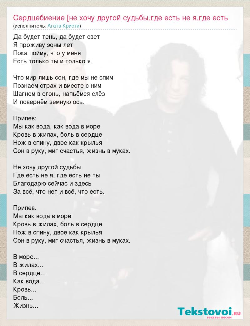 Главная→Исполнители→Агата Кристи→Сердцебиение [не хочу другой судьбы.где есть не я.где есть не ты.благода