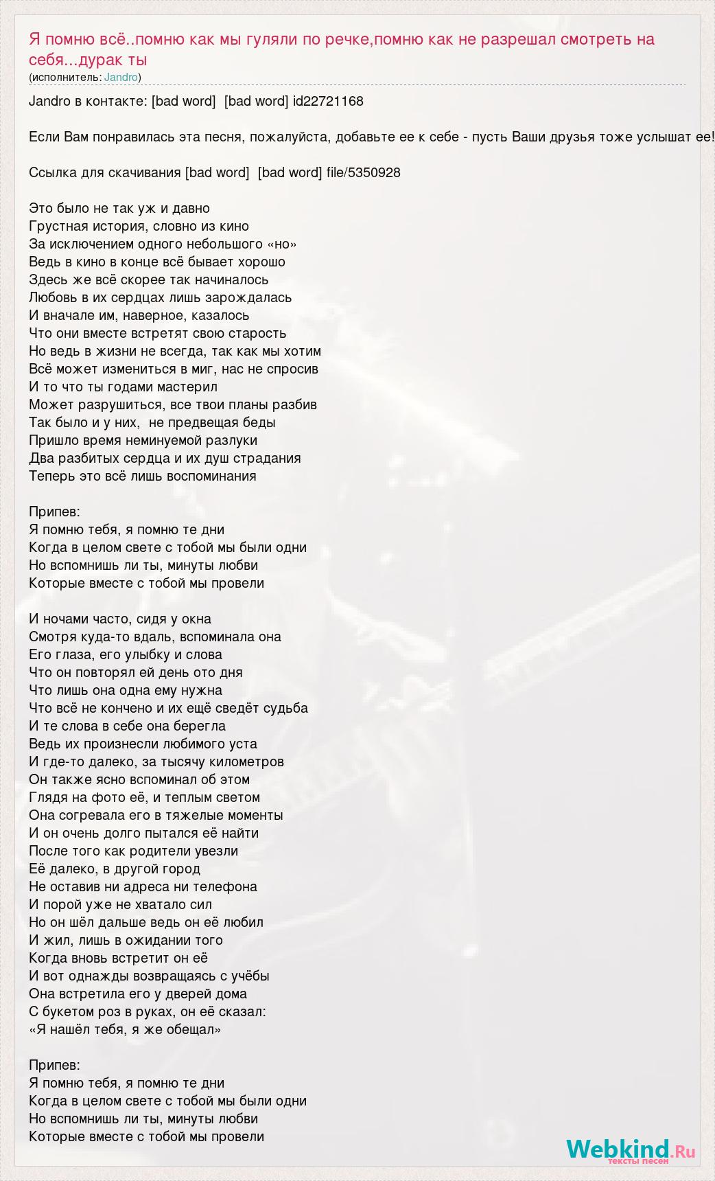 Jandro в контакте: [bad word] [bad word] id22721168 Если Вам понравилась эта песня, пожалуйста, добавьте ее к себе - пусть Ваши друзья тоже услышат ее! Ссылка для скачивания [bad word] [bad word] file/5350928 Это было не так уж и давно Грустная история, словно из кино За исключением одного небольшого «но» Ведь в кино в конце всё бывает хорошо Здесь же всё скорее так начиналось Любовь в их сердцах лишь зарождалась И вначале им, наверное, казалось Что они вместе встретят свою старость Но ведь в жизни не всегда, так как мы хотим Всё может измениться в миг, нас не спросив И то что ты годами мастерил Может разрушиться, все твои планы разбив Так было и у них, не предвещая беды Пришло время неминуемой разлуки Два разбитых сердца и их душ страдания Теперь это всё лишь воспоминания Припев: Я помню тебя, я помню те дни Когда в целом свете с тобой мы были одни Но вспомнишь ли ты, минуты любви Которые вместе с тобой мы провели И ночами часто, сидя у окна Смотря куда-то вдаль, вспоминала она Его глаза, его улыбку и слова Что он повторял ей день ото дня Что лишь она одна ему нужна Что всё не кончено и их ещё сведёт судьба И те слова в себе она берегла Ведь их произнесли любимого уста И где-то далеко, за тысячу километров Он также ясно вспоминал об этом Глядя на фото её, и теплым светом Она согревала его в тяжелые моменты И он очень долго пытался её найти После того как родители увезли Её далеко, в другой город Не оставив ни адреса ни телефона И порой уже не хватало сил Но он шёл дальше ведь он её любил И жил, лишь в ожидании того Когда вновь встретит он её И вот однажды возвращаясь с учёбы Она встретила его у дверей дома С букетом роз в руках, он её сказал: «Я нашёл тебя, я же обещал» Припев: Я помню тебя, я помню те дни Когда в целом свете с тобой мы были одни Но вспомнишь ли ты, минуты любви Которые вместе с тобой мы провели