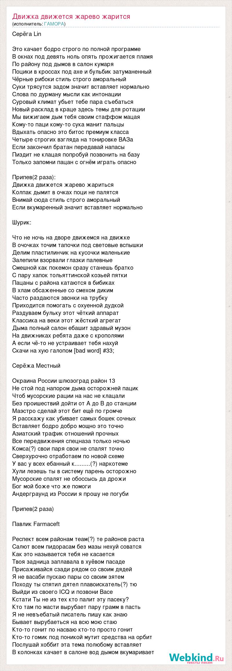 Серёга Lin Это качает бодро строго по полной программе В окнах под девять ноль опять прожигается пламя По району под дымов в салон кумаря Поцики в кроссах под ахе и бульбик затуманенный Чёрные рибоки стиль строго аморальный Суки трясутся задом значит вставляет нормально Слова по дурману мысли как интонации Суровый климат убьет тебе пара съебаться Новый расклад в краце здесь темы для ротации Мы вижигаем дым тебя своим стаффом мацая Кому-то паци кому-то сука манит пальцы Вдыхать опасно это битос премиум класса Четыре строгих взгляда на тонировке ВАЗа Если закончил братан передавай напасы Пиздит не клацая попробуй позвонить на базу Только запомни пацан с огнём играть опасно Припев(2 раза): Движка движется жарево жариться Колпак дымит в очках поци не палятся Внимай сюда стиль строго аморальный Если вкумаренный значит вставляет нормально Шурик: Что не ночь на дворе движемся на движке В очочках точим тапочки под световые вспышки Делим пластилинчик на кусочки маленькие Залепили взорвали глазки палевные Смешной как покемон сразу станешь братко С пару хапок тольяттинской козьей пятки Пацаны с района катаются в бибиках В хлам обсаженные со смехом диким Часто раздаются звонки на трубку Приходится помогать с охуенной дудкой Раздуваем бульку этот чёткий аппарат Классика на веки этот жёсткий агрегат Дыма полный салон ебашит здравый музон На движниках ребята даже с крополями А если чё-то не устраивает тебя нахуй Скачи на хую галопом [bad word] #33; Серёжа Местный Окраина России шлюзоград район 13 Не стой под напором дыма осторожней пацик Чтоб мусорские рации на нас не клацали Без проишествий дойти от А до В до станции Маэстро сделай этот бит ещё по громче Я расскажу как убивает самых бошек сочных Вставляет бодро добро мощно это точно Азиатский трафик отношений прочных Все передвижения спецназа только ночью Комса(?) свои паря свои не спалят точно Сверхурочно отработаем по новой схеме У вас у всех ебанный к.........(?) наркотеме Хули лезешь ты в систему парень осторожно Мусорские спалят не обоссысь да дрожи Бог мой боже что же помоги Андерграунд из России я прошу не погуби Припев(2 раза) Павлик Farmaceft Респект всем районам теам(?) те районов раста Салют всем пидорасам без мазы нехуй соватся Как это называется тебя не касается Твоя задница заплавала в хуёвом пасаде Присаживайся сзади рядом со своим дядей Я не васаби пускаю пары со своим зятем Походу ты спятил дятел плавоискатель(?) тю Выйди из своего ICQ и позвони Васе Кстати Ты не из тех кто палит эту пасеку? Кто там по масти вырубает пару грамм в пасть Я не невъебатый писатель пишу как знаю Бывает вырубаеться на всю мою стаю Кто-то гонит по насваю кто-то просто гонит Кто-то гомик под поникой мутит средства на орбит Послушай хоббит эта тема полюбому вставляет В колонках качает в салоне вод дымом вкумаривает