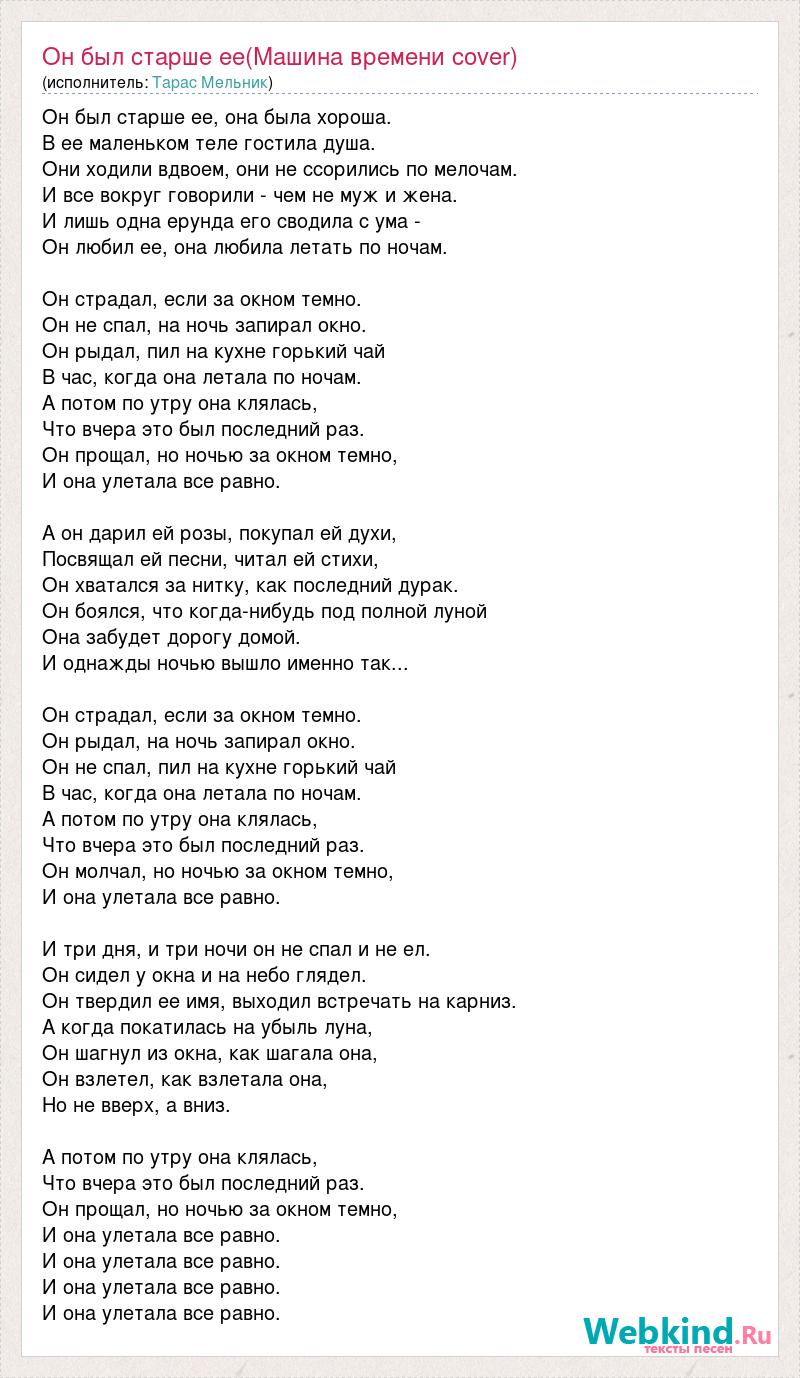 Он был старше ее, она была хороша. В ее маленьком теле гостила душа. Они ходили вдвоем, они не ссорились по мелочам. И все вокруг говорили - чем не муж и жена. И лишь одна ерунда его сводила с ума - Он любил ее, она любила летать по ночам. Он страдал, если за окном темно. Он не спал, на ночь запирал окно. Он рыдал, пил на кухне горький чай В час, когда она летала по ночам. А потом по утру она клялась, Что вчера это был последний раз. Он прощал, но ночью за окном темно, И она улетала все равно. А он дарил ей розы, покупал ей духи, Посвящал ей песни, читал ей стихи, Он хватался за нитку, как последний дурак. Он боялся, что когда-нибудь под полной луной Она забудет дорогу домой. И однажды ночью вышло именно так... Он страдал, если за окном темно. Он рыдал, на ночь запирал окно. Он не спал, пил на кухне горький чай В час, когда она летала по ночам. А потом по утру она клялась, Что вчера это был последний раз. Он молчал, но ночью за окном темно, И она улетала все равно. И три дня, и три ночи он не спал и не ел. Он сидел у окна и на небо глядел. Он твердил ее имя, выходил встречать на карниз. А когда покатилась на убыль луна, Он шагнул из окна, как шагала она, Он взлетел, как взлетала она, Но не вверх, а вниз. А потом по утру она клялась, Что вчера это был последний раз. Он прощал, но ночью за окном темно, И она улетала все равно. И она улетала все равно. И она улетала все равно. И она улетала все равно.