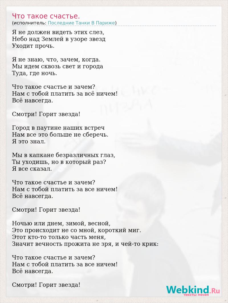 Я не должен видеть этих слез, Небо над Землей в узоре звезд Уходит прочь. Я не знаю, что, зачем, когда. Мы идем сквозь свет и города Туда, где ночь. Что такое счастье и зачем? Нам с тобой платить за всё ничем! Всё навсегда. Смотри! Горит звезда! Город в паутине наших встреч Нам все это больше не сберечь. Я это знал. Мы в капкане безразличных глаз, Ты уходишь, но в который раз? Я все сказал. Что такое счастье и зачем? Нам с тобой платить за все ничем! Всё навсегда. Смотри! Горит звезда! Ночью или днем, зимой, весной, Это происходит не со мной, короткий миг. Этот кто-то только часть меня, Значит вечность прожита не зря, и чей-то крик: Что такое счастье и зачем? Нам с тобой платить за все ничем! Всё навсегда. Смотри! Горит звезда!
