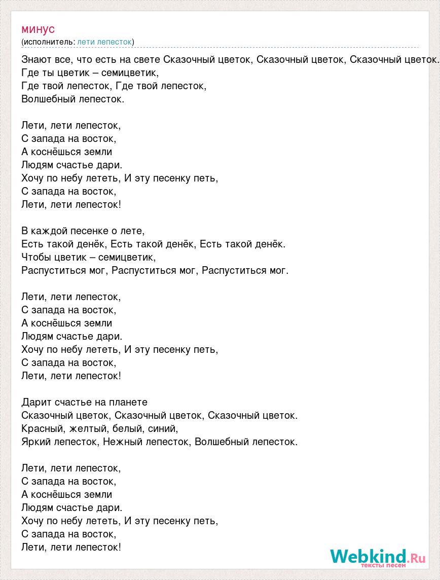 Знают все, что есть на свете Сказочный цветок, Сказочный цветок, Сказочный цветок. Где ты цветик – семицветик, Где твой лепесток, Где твой лепесток, Волшебный лепесток. Лети, лети лепесток, С запада на восток, А коснёшься земли Людям счастье дари. Хочу по небу лететь, И эту песенку петь, С запада на восток, Лети, лети лепесток! В каждой песенке о лете, Есть такой денёк, Есть такой денёк, Есть такой денёк. Чтобы цветик – семицветик, Распуститься мог, Распуститься мог, Распуститься мог. Лети, лети лепесток, С запада на восток, А коснёшься земли Людям счастье дари. Хочу по небу лететь, И эту песенку петь, С запада на восток, Лети, лети лепесток! Дарит счастье на планете Сказочный цветок, Сказочный цветок, Сказочный цветок. Красный, желтый, белый, синий, Яркий лепесток, Нежный лепесток, Волшебный лепесток. Лети, лети лепесток, С запада на восток, А коснёшься земли Людям счастье дари. Хочу по небу лететь, И эту песенку петь, С запада на восток, Лети, лети лепесток!