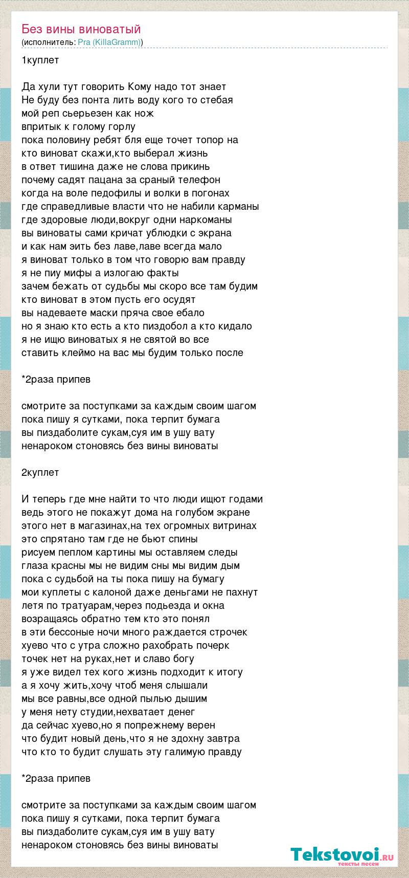 1куплет Да хули тут говорить Кому надо тот знает Не буду без понта лить воду кого то стебая мой реп сьерьезен как нож впритык к голому горлу пока половину ребят бля еще точет топор на кто виноват скажи,кто выберал жизнь в ответ тишина даже не слова прикинь почему садят пацана за сраный телефон когда на воле педофилы и волки в погонах где справедливые власти что не набили карманы где здоровые люди,вокруг одни наркоманы вы виноваты сами кричат ублюдки с экрана и как нам эить без лаве,лаве всегда мало я виноват только в том что говорю вам правду я не пиу мифы а излогаю факты зачем бежать от судьбы мы скоро все там будим кто виноват в этом пусть его осудят вы надеваете маски пряча свое ебало но я знаю кто есть а кто пиздобол а кто кидало я не ищю виноватых я не святой во все ставить клеймо на вас мы будим только после *2раза припев смотрите за поступками за каждым своим шагом пока пишу я сутками, пока терпит бумага вы пиздаболите сукам,суя им в ушу вату ненароком стоновясь без вины виноваты 2куплет И теперь где мне найти то что люди ищют годами ведь этого не покажут дома на голубом экране этого нет в магазинах,на тех огромных витринах это спрятано там где не бьют спины рисуем пеплом картины мы оставляем следы глаза красны мы не видим сны мы видим дым пока с судьбой на ты пока пишу на бумагу мои куплеты с калоной даже деньгами не пахнут летя по тратуарам,через подьезда и окна возращаясь обратно тем кто это понял в эти бессоные ночи много раждается строчек хуево что с утра сложно рахобрать почерк точек нет на руках,нет и славо богу я уже видел тех кого жизнь подходит к итогу а я хочу жить,хочу чтоб меня слышали мы все равны,все одной пылью дышим у меня нету студии,нехватает денег да сейчас хуево,но я попрежнему верен что будит новый день,что я не здохну завтра что кто то будит слушать эту галимую правду *2раза припев смотрите за поступками за каждым своим шагом пока пишу я сутками, пока терпит бумага вы пиздаболите сукам,суя им в ушу вату ненароком стоновясь без вины виноваты