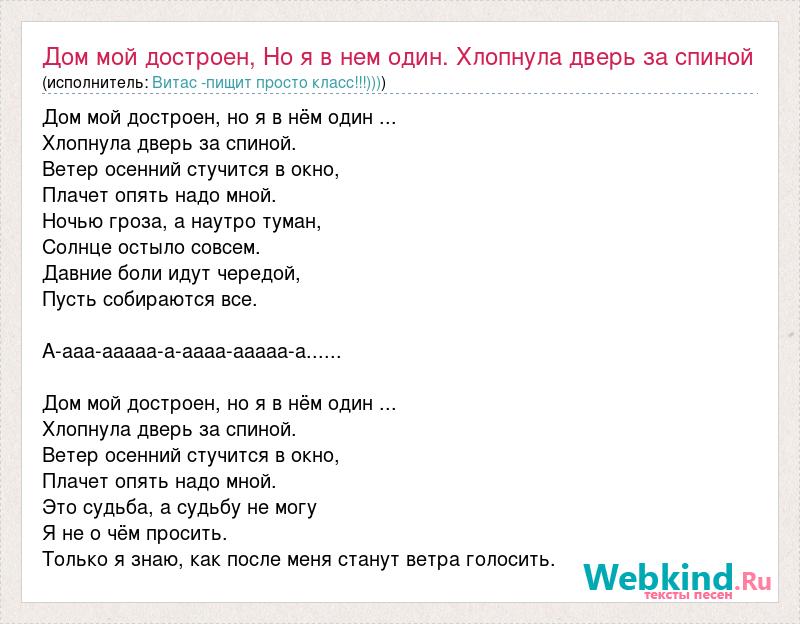 Главная→Исполнители→Витас -пищит просто класс!!!)))→Дом мой достроен, Но я в нем один. Хлопнула дверь за спиной Ветер осенний ст