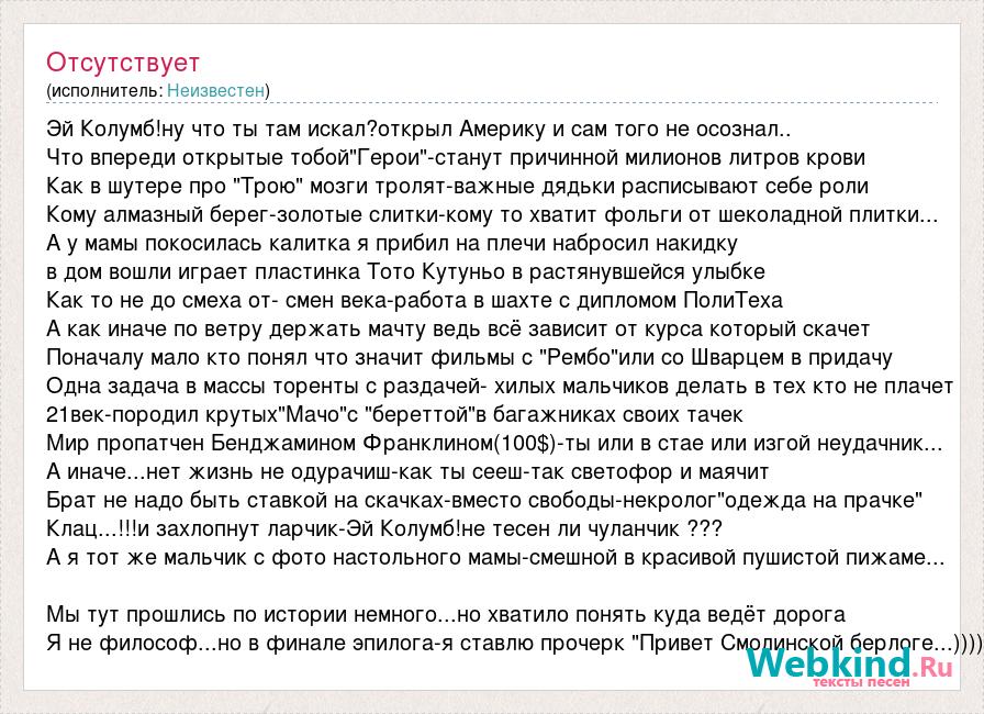 Эй Колумб!ну что ты там искал?открыл Америку и сам того не осознал.. Что впереди открытые тобой"Герои"-станут причинной милионов литров крови Как в шутере про "Трою" мозги тролят-важные дядьки расписывают себе роли Кому алмазный берег-золотые слитки-кому то хватит фольги от шеколадной плитки... А у мамы покосилась калитка я прибил на плечи набросил накидку в дом вошли играет пластинка Тото Кутуньо в растянувшейся улыбке Как то не до смеха от- смен века-работа в шахте с дипломом ПолиТеха А как иначе по ветру держать мачту ведь всё зависит от курса который скачет Поначалу мало кто понял что значит фильмы с "Рембо"или со Шварцем в придачу Одна задача в массы торенты с раздачей- хилых мальчиков делать в тех кто не плачет 21век-породил крутых"Мачо"с "береттой"в багажниках своих тачек Мир пропатчен Бенджамином Франклином(100$)-ты или в стае или изгой неудачник... А иначе...нет жизнь не одурачиш-как ты сееш-так светофор и маячит Брат не надо быть ставкой на скачках-вместо свободы-некролог"одежда на прачке" Клац...!!!и захлопнут ларчик-Эй Колумб!не тесен ли чуланчик ??? А я тот же мальчик с фото настольного мамы-смешной в красивой пушистой пижаме... Мы тут прошлись по истории немного...но хватило понять куда ведёт дорога Я не философ...но в финале эпилога-я ставлю прочерк "Привет Смолинской берлоге...))))