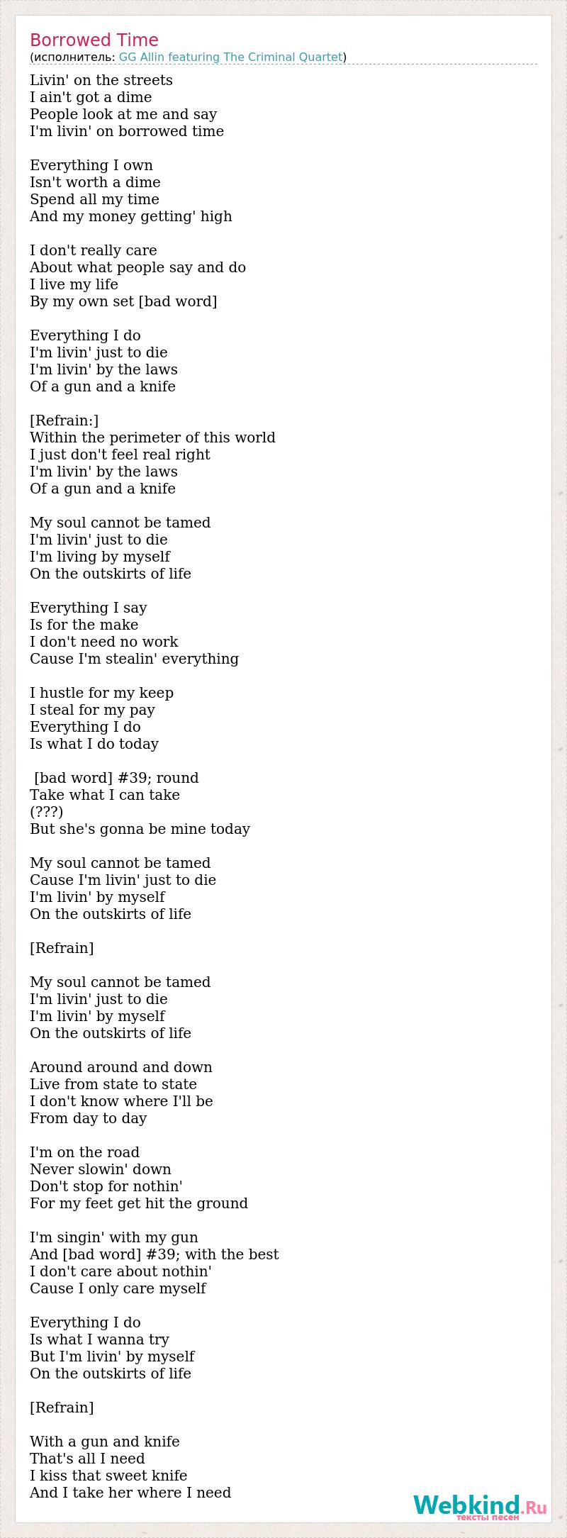 Livin' on the streets I ain't got a dime People look at me and say I'm livin' on borrowed time Everything I own Isn't worth a dime Spend all my time And my money getting' high I don't really care About what people say and do I live my life By my own set [bad word] Everything I do I'm livin' just to die I'm livin' by the laws Of a gun and a knife [Refrain:] Within the perimeter of this world I just don't feel real right I'm livin' by the laws Of a gun and a knife My soul cannot be tamed I'm livin' just to die I'm living by myself On the outskirts of life Everything I say Is for the make I don't need no work Cause I'm stealin' everything I hustle for my keep I steal for my pay Everything I do Is what I do today [bad word] #39; round Take what I can take (???) But she's gonna be mine today My soul cannot be tamed Cause I'm livin' just to die I'm livin' by myself On the outskirts of life [Refrain] My soul cannot be tamed I'm livin' just to die I'm livin' by myself On the outskirts of life Around around and down Live from state to state I don't know where I'll be From day to day I'm on the road Never slowin' down Don't stop for nothin' For my feet get hit the ground I'm singin' with my gun And [bad word] #39; with the best I don't care about nothin' Cause I only care myself Everything I do Is what I wanna try But I'm livin' by myself On the outskirts of life [Refrain] With a gun and knife That's all I need I kiss that sweet knife And I take her where I need