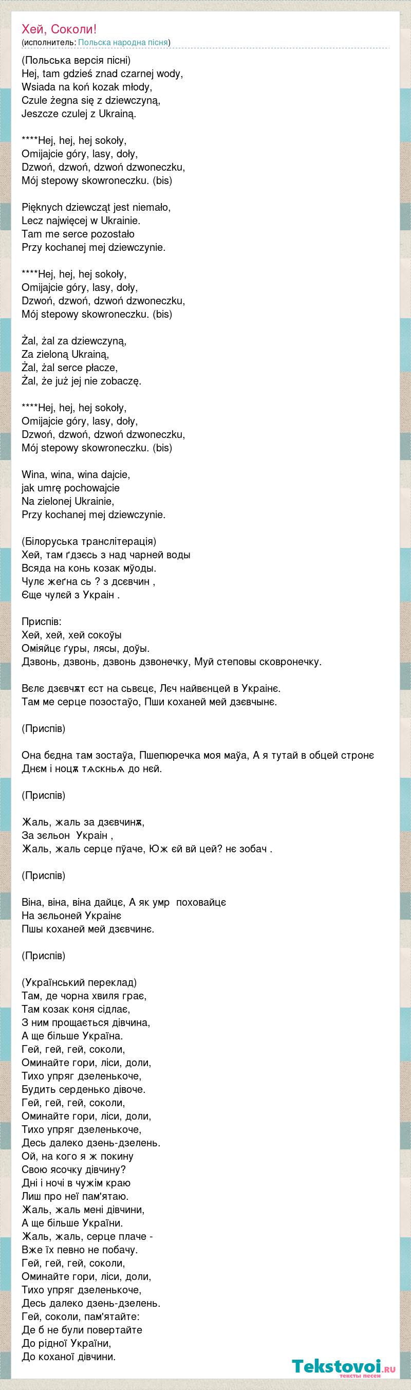 (Польська версія пісні) Hej, tam gdzieś znad czarnej wody, Wsiada na koń kozak młody, Czule żegna się z dziewczyną, Jeszcze czulej z Ukrainą. ****Hej, hej, hej sokoły, Omijajcie góry, lasy, doły, Dzwoń, dzwoń, dzwoń dzwoneczku, Mój stepowy skowroneczku. (bis) Pięknych dziewcząt jest niemało, Lecz najwięcej w Ukrainie. Tam me serce pozostało Przy kochanej mej dziewczynie. ****Hej, hej, hej sokoły, Omijajcie góry, lasy, doły, Dzwoń, dzwoń, dzwoń dzwoneczku, Mój stepowy skowroneczku. (bis) Żal, żal za dziewczyną, Za zieloną Ukrainą, Żal, żal serce płacze, Żal, że już jej nie zobaczę. ****Hej, hej, hej sokoły, Omijajcie góry, lasy, doły, Dzwoń, dzwoń, dzwoń dzwoneczku, Mój stepowy skowroneczku. (bis) Wina, wina, wina dajcie, jak umrę pochowajcie Na zielonej Ukrainie, Przy kochanej mej dziewczynie. (Білоруська транслітерація) Хей, там ґдзєсь з над ча́рней во́ды Вся́да на конь ко́зак мўо́ды. Чу́лє жеґна сьѧ? з дсєвчинѫ, Єще чу́лєй з Украінѫ. Приспів: Хей, хей, хей соко́ўы Омія́йцє ґу́ры, ля́сы, доўы. Дзвонь, дзвонь, дзвонь дзвонечку, Муй степо́вы сковронечку. Вєлє дзєвчѫт єст на сьвєцє, Лєч найвєнцей в Украінє. Там ме серце позоста́ўо, Пши коха́ней мей дзєвчынє. (Приспів) О́на бєдна там зоста́ўа, Пшепюречка моя ма́ўа, А я ту́тай в о́бцей стро́нє Днєм і ноцѫ тѧскньѧ до нєй. (Приспів) Жаль, жаль за дзєвчинѫ, За зєльо́нѫ Украінѫ, Жаль, жаль серце пўа́че, Юж єй вйѧцей? нє зоба́чѧ. (Приспів) Віна, віна, віна да́йцє, А як у́мрѧ похова́йцє На зєльоней Украінє Пшы коханей мей дзєвчинє. (Приспів) (Український переклад) Там, де чорна хвиля грає, Там козак коня сідлає, З ним прощається дівчина, А ще більше Україна. Гей, гей, гей, соколи, Оминайте гори, ліси, доли, Тихо упряг дзеленькоче, Будить серденько дівоче. Гей, гей, гей, соколи, Оминайте гори, ліси, доли, Тихо упряг дзеленькоче, Десь далеко дзень-дзелень. Ой, на кого я ж покину Свою ясочку дівчину? Дні і ночі в чужім краю Лиш про неї пам'ятаю. Жаль, жаль мені дівчини, А ще більше України. Жаль, жаль, серце плаче - Вже їх певно не побачу. Гей, гей, гей, сокoли, Оминайте гори, ліси, доли, Тихо упряг дзеленькоче, Десь далеко дзень-дзелень. Гей, соколи, пам'ятайте: Де б не були повертайте До рідної України, До коханої дівчини.