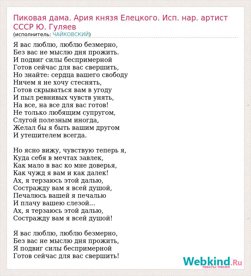 Я вас люблю, люблю безмерно, Без вас не мыслю дня прожить. И подвиг силы беспримерной Готов сейчас для вас свершить, Но знайте: сердца вашего свободу Ничем я не хочу стеснять, Готов скрываться вам в угоду И пыл ревнивых чувств унять, На все, на все для вас готов! Не только любящим супругом, Слугой полезным иногда, Желал бы я быть вашим другом И утешителем всегда. Но ясно вижу, чувствую теперь я, Куда себя в мечтах завлек, Как мало в вас ко мне доверья, Как чужд я вам и как далек! Ах, я терзаюсь этой далью, Состражду вам я всей душой, Печалюсь вашей я печалью И плачу вашею слезой... Ах, я терзаюсь этой далью, Состражду вам я всей душой! Я вас люблю, люблю безмерно, Без вас не мыслю дня прожить, Я подвиг силы беспримерной Готов сейчас для вас свершить!