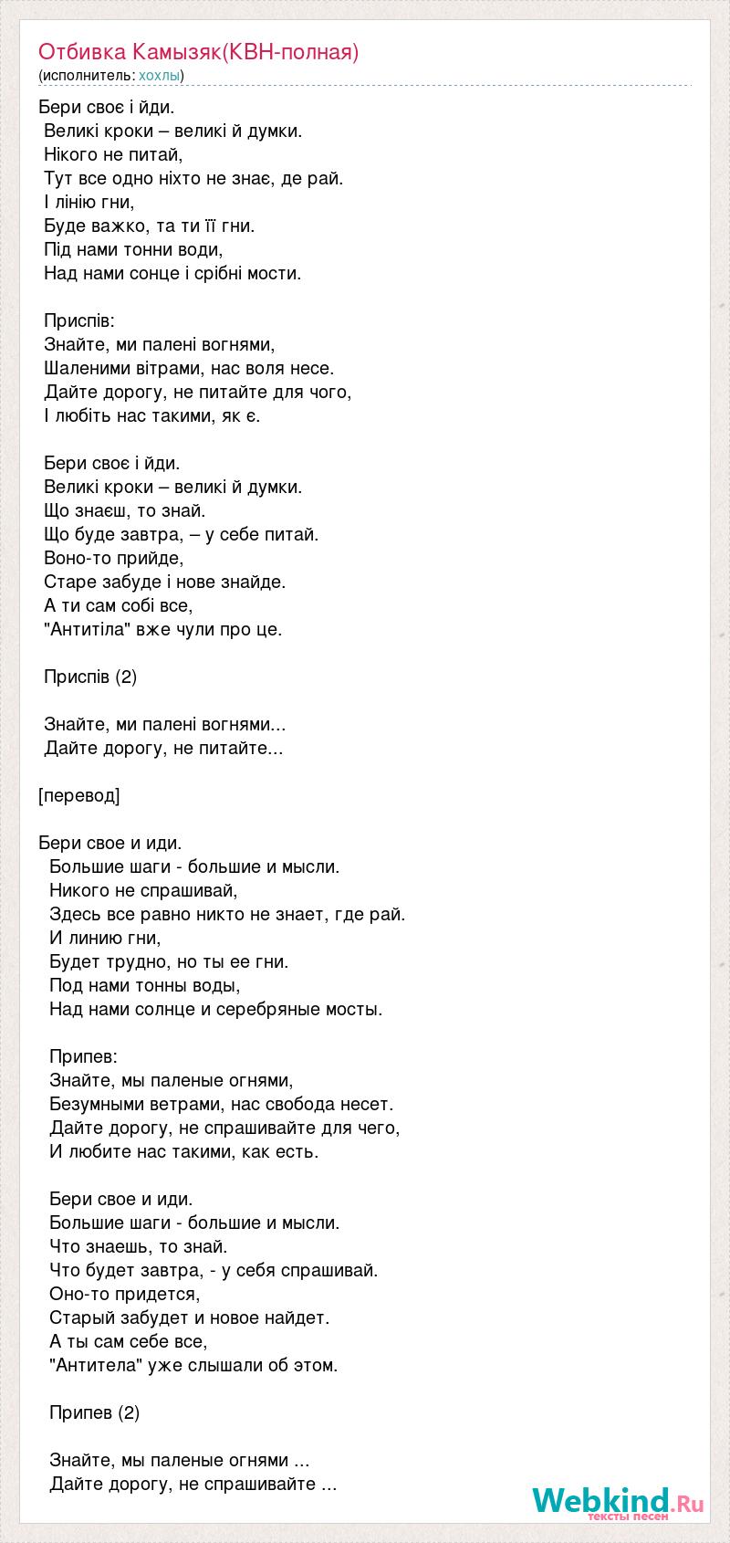 Бери своє і йди. Великі кроки – великі й думки. Нікого не питай, Тут все одно ніхто не знає, де рай. І лінію гни, Буде важко, та ти її гни. Під нами тонни води, Над нами сонце і срібні мости. Приспів: Знайте, ми палені вогнями, Шаленими вітрами, нас воля несе. Дайте дорогу, не питайте для чого, І любіть нас такими, як є. Бери своє і йди. Великі кроки – великі й думки. Що знаєш, то знай. Що буде завтра, – у себе питай. Воно-то прийде, Старе забуде і нове знайде. А ти сам собі все, "Антитіла" вже чули про це. Приспів (2) Знайте, ми палені вогнями... Дайте дорогу, не питайте... [перевод] Бери свое и иди. Большие шаги - большие и мысли. Никого не спрашивай, Здесь все равно никто не знает, где рай. И линию гни, Будет трудно, но ты ее гни. Под нами тонны воды, Над нами солнце и серебряные мосты. Припев: Знайте, мы паленые огнями, Безумными ветрами, нас свобода несет. Дайте дорогу, не спрашивайте для чего, И любите нас такими, как есть. Бери свое и иди. Большие шаги - большие и мысли. Что знаешь, то знай. Что будет завтра, - у себя спрашивай. Оно-то придется, Старый забудет и новое найдет. А ты сам себе все, "Антитела" уже слышали об этом. Припев (2) Знайте, мы паленые огнями ... Дайте дорогу, не спрашивайте ...