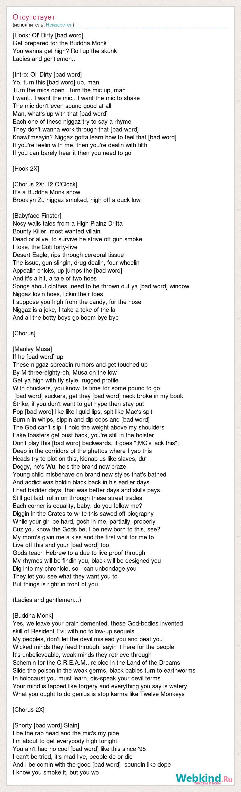 [Hook: Ol' Dirty [bad word] Get prepared for the Buddha Monk You wanna get high? Roll up the skunk Ladies and gentlemen.. [Intro: Ol' Dirty [bad word] Yo, turn this [bad word] up, man Turn the mics open.. turn the mic up, man I want.. I want the mic.. I want the mic to shake The mic don't even sound good at all Man, what's up with that [bad word] Each one of these niggaz try to say a rhyme They don't wanna work through that [bad word] KnawI'msayin? Niggaz gotta learn how to feel that [bad word] . If you're feelin with me, then you're dealin with filth If you can barely hear it then you need to go [Hook 2X] [Chorus 2X: 12 O'Clock] It's a Buddha Monk show Brooklyn Zu niggaz smoked, high off a duck low [Babyface Finster] Nosy wails tales from a High Plainz Drifta Bounty Killer, most wanted villain Dead or alive, to survive he strive off gun smoke I toke, the Colt forty-five Desert Eagle, rips through cerebral tissue The issue, gun slingin, drug dealin, four wheelin Appealin chicks, up jumps the [bad word] And it's a hit, a tale of two hoes Songs about clothes, need to be thrown out ya [bad word] window Niggaz lovin hoes, lickin their toes I suppose you high from the candy, for the nose Niggaz is a joke, I take a toke of the la And all the botty boys go boom bye bye [Chorus] [Manley Musa] If he [bad word] up These niggaz spreadin rumors and get touched up By M three-eighty-oh, Musa on the low Get ya high with fly style, rugged profile With chuckers, you know its time for some pound to go [bad word] suckers, get they [bad word] neck broke in my book Strike, if you don't want to get hype then stay put Pop [bad word] like like liquid lips, spit like Mac's spit Burnin in whips, sippin and dip cops and [bad word] The God can't slip, I hold the weight above my shoulders Fake toasters get bust back, you're still in the holster Don't play this [bad word] backwards, it goes ";MC's lack this"; Deep in the corridors of the ghettos where I yap this Heads try to plot on this, kidnap us like slaves, du' Doggy, he's Wu, he's the brand new craze Young child misbehave on brand new styles that's bathed And addict was holdin black back in his earlier days I had badder days, that was better days and skills pays Still got laid, rollin on through these street trades Each corner is equality, baby, do you follow me? Diggin in the Crates to write this sawed off biography While your girl be hard, gosh in me, partially, properly Cuz you know the Gods be, I be new born to this, see? My mom's givin me a kiss and the first whif for me to Live off this and your [bad word] too Gods teach Hebrew to a due to live proof through My rhymes will be findin you, black will be designed you Dig into my chronicle, so I can unbondage you They let you see what they want you to But things is right in front of you (Ladies and gentlemen...) [Buddha Monk] Yes, we leave your brain demented, these God-bodies invented skill of Resident Evil with no follow-up sequels My peoples, don't let the devil mislead you and beat you Wicked minds they feed through, sayin it here for the people It's unbelieveable, weak minds they retrieve through Schemin for the C.R.E.A.M., rejoice in the Land of the Dreams Slide the poison in the weak germs, black babies turn to earthworms In holocaust you must learn, dis-speak your devil terms Your mind is tapped like forgery and everything you say is watery What you ought to do genius is stop karma like Twelve Monkeys [Chorus 2X] [Shorty [bad word] Stain] I be the rap head and the mic's my pipe I'm about to get everybody high tonight You ain't had no cool [bad word] like this since '95 I can't be tried, it's mad live, people do or die And I be comin with the good [bad word] soundin like dope I know you smoke it, but you wo