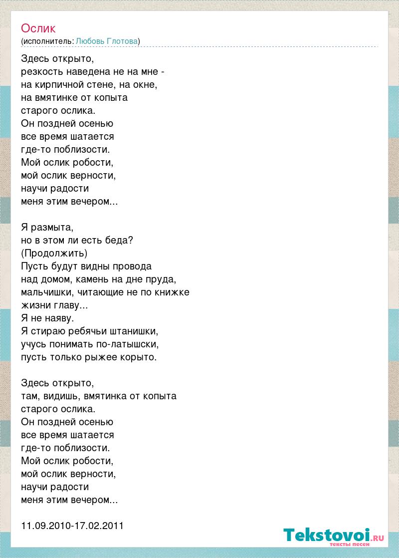 Здесь открыто, резкость наведена не на мне - на кирпичной стене, на окне, на вмятинке от копыта старого ослика. Он поздней осенью все время шатается где-то поблизости. Мой ослик робости, мой ослик верности, научи радости меня этим вечером... Я размыта, но в этом ли есть беда? (Продолжить) Пусть будут видны провода над домом, камень на дне пруда, мальчишки, читающие не по книжке жизни главу... Я не наяву. Я стираю ребячьи штанишки, учусь понимать по-латышски, пусть только рыжее корыто. Здесь открыто, там, видишь, вмятинка от копыта старого ослика. Он поздней осенью все время шатается где-то поблизости. Мой ослик робости, мой ослик верности, научи радости меня этим вечером... 11.09.2010-17.02.2011
