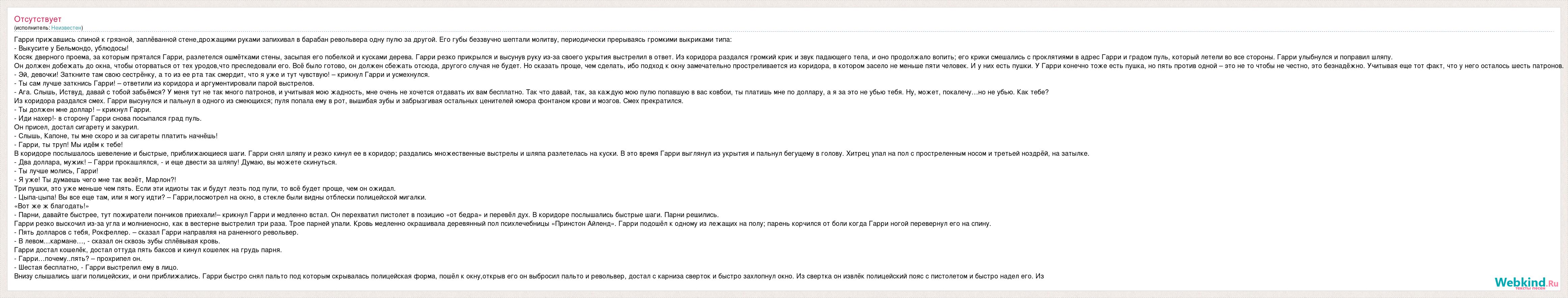 Гарри прижавшись спиной к грязной, заплёванной стене,дрожащими руками запихивал в барабан револьвера одну пулю за другой. Его губы беззвучно шептали молитву, периодически прерываясь громкими выкриками типа: - Выкусите у Бельмондо, ублюдосы! Косяк дверного проема, за которым прятался Гарри, разлетелся ошмётками стены, засыпая его побелкой и кусками дерева. Гарри резко прикрылся и высунув руку из-за своего укрытия выстрелил в ответ. Из коридора раздался громкий крик и звук падающего тела, и оно продолжало вопить; его крики смешались с проклятиями в адрес Гарри и градом пуль, который летели во все стороны. Гарри улыбнулся и поправил шляпу. Он должен добежать до окна, чтобы оторваться от тех уродов,что преследовали его. Всё было готово, он должен сбежать отсюда, другого случая не будет. Но сказать проще, чем сделать, ибо подход к окну замечательно простреливается из коридора, в котором засело не меньше пяти человек. И у них есть пушки. У Гарри конечно тоже есть пушка, но пять против одной – это не то чтобы не честно, это безнадёжно. Учитывая еще тот факт, что у него осталось шесть патронов. - Эй, девочки! Заткните там свою сестрёнку, а то из ее рта так смердит, что я уже и тут чувствую! – крикнул Гарри и усмехнулся. - Ты сам лучше заткнись Гарри! – ответили из коридора и аргументировали парой выстрелов. - Ага. Слышь, Иствуд, давай с тобой забьёмся? У меня тут не так много патронов, и учитывая мою жадность, мне очень не хочется отдавать их вам бесплатно. Так что давай, так, за каждую мою пулю попавшую в вас ковбои, ты платишь мне по доллару, а я за это не убью тебя. Ну, может, покалечу…но не убью. Как тебе? Из коридора раздался смех. Гарри высунулся и пальнул в одного из смеющихся; пуля попала ему в рот, вышибая зубы и забрызгивая остальных ценителей юмора фонтаном крови и мозгов. Смех прекратился. - Ты должен мне доллар! – крикнул Гарри. - Иди нахер!- в сторону Гарри снова посыпался град пуль. Он присел, достал сигарету и закурил. - Слышь, Капоне, ты мне скоро и за сигареты платить начнёшь! - Гарри, ты труп! Мы идём к тебе! В коридоре послышалось шевеление и быстрые, приближающиеся шаги. Гарри снял шляпу и резко кинул ее в коридор; раздались множественные выстрелы и шляпа разлетелась на куски. В это время Гарри выглянул из укрытия и пальнул бегущему в голову. Хитрец упал на пол с простреленным носом и третьей ноздрёй, на затылке. - Два доллара, мужик! – Гарри прокашлялся, - и еще двести за шляпу! Думаю, вы можете скинуться. - Ты лучше молись, Гарри! - Я уже! Ты думаешь чего мне так везёт, Марлон?! Три пушки, это уже меньше чем пять. Если эти идиоты так и будут лезть под пули, то всё будет проще, чем он ожидал. - Цыпа-цыпа! Вы все еще там, или я могу идти? – Гарри,посмотрел на окно, в стекле были видны отблески полицейской мигалки. «Вот же ж благодать!» - Парни, давайте быстрее, тут пожиратели пончиков приехали!– крикнул Гарри и медленно встал. Он перехватил пистолет в позицию «от бедра» и перевёл дух. В коридоре послышались быстрые шаги. Парни решились. Гарри резко выскочил из-за угла и молниеносно, как в вестерне выстрелил три раза. Трое парней упали. Кровь медленно окрашивала деревянный пол психлечебницы «Принстон Айленд». Гарри подошёл к одному из лежащих на полу; парень корчился от боли когда Гарри ногой перевернул его на спину. - Пять долларов с тебя, Рокфеллер. – сказал Гарри н