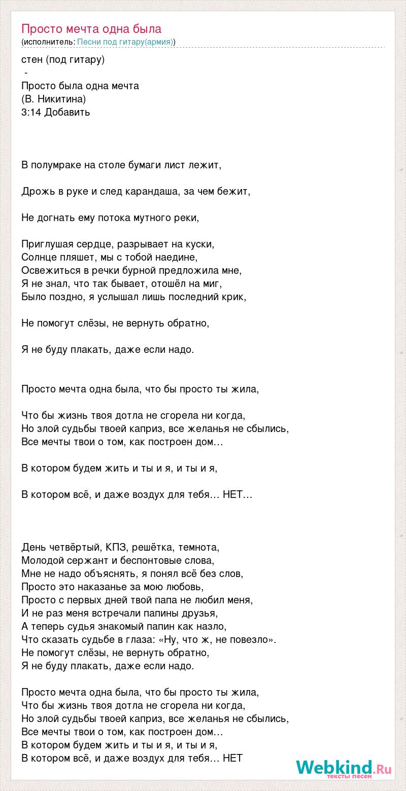 стен (под гитару) - Просто была одна мечта (В. Никитина) 3:14 Добавить В полумраке на столе бумаги лист лежит, Дрожь в руке и след карандаша, за чем бежит, Не догнать ему потока мутного реки, Приглушая сердце, разрывает на куски, Солнце пляшет, мы с тобой наедине, Освежиться в речки бурной предложила мне, Я не знал, что так бывает, отошёл на миг, Было поздно, я услышал лишь последний крик, Не помогут слёзы, не вернуть обратно, Я не буду плакать, даже если надо. Просто мечта одна была, что бы просто ты жила, Что бы жизнь твоя дотла не сгорела ни когда, Но злой судьбы твоей каприз, все желанья не сбылись, Все мечты твои о том, как построен дом… В котором будем жить и ты и я, и ты и я, В котором всё, и даже воздух для тебя… НЕТ… День четвёртый, КПЗ, решётка, темнота, Молодой сержант и беспонтовые слова, Мне не надо объяснять, я понял всё без слов, Просто это наказанье за мою любовь, Просто с первых дней твой папа не любил меня, И не раз меня встречали папины друзья, А теперь судья знакомый папин как назло, Что сказать судьбе в глаза: «Ну, что ж, не повезло». Не помогут слёзы, не вернуть обратно, Я не буду плакать, даже если надо. Просто мечта одна была, что бы просто ты жила, Что бы жизнь твоя дотла не сгорела ни когда, Но злой судьбы твоей каприз, все желанья не сбылись, Все мечты твои о том, как построен дом… В котором будем жить и ты и я, и ты и я, В котором всё, и даже воздух для тебя… НЕТ
