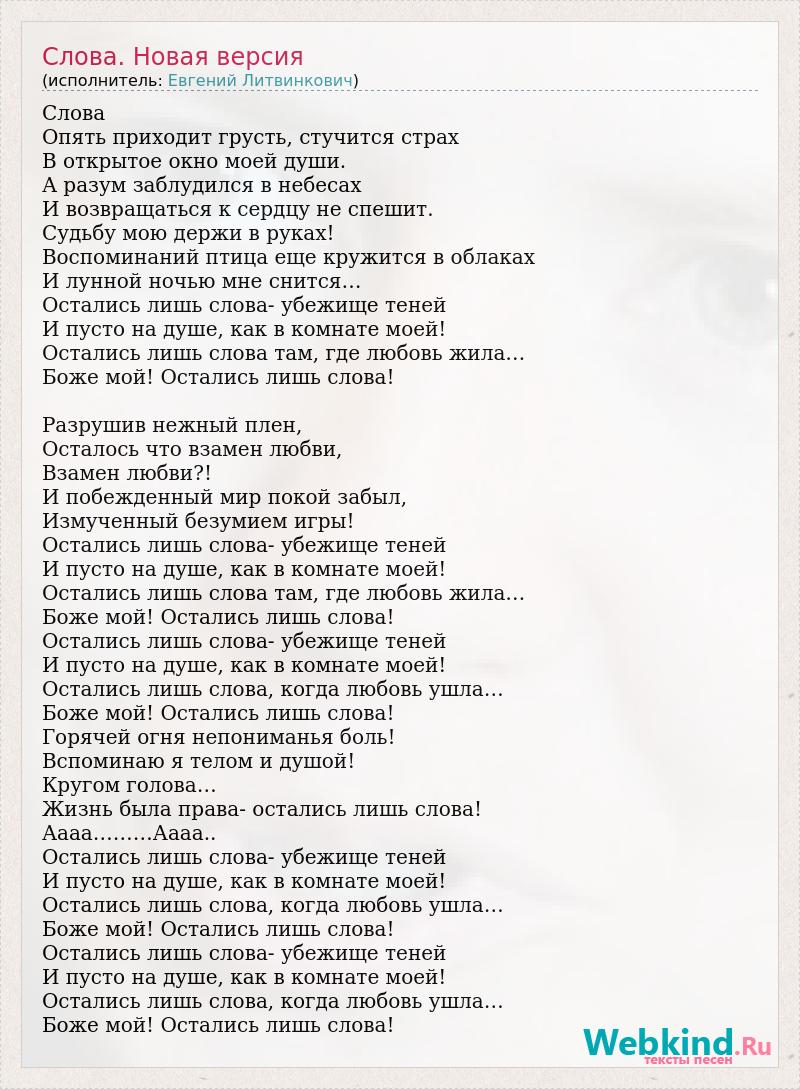 Слова Опять приходит грусть, стучится страх В открытое окно моей души. А разум заблудился в небесах И возвращаться к сердцу не спешит. Судьбу мою держи в руках! Воспоминаний птица еще кружится в облаках И лунной ночью мне снится… Остались лишь слова- убежище теней И пусто на душе, как в комнате моей! Остались лишь слова там, где любовь жила… Боже мой! Остались лишь слова! Разрушив нежный плен, Осталось что взамен любви, Взамен любви?! И побежденный мир покой забыл, Измученный безумием игры! Остались лишь слова- убежище теней И пусто на душе, как в комнате моей! Остались лишь слова там, где любовь жила… Боже мой! Остались лишь слова! Остались лишь слова- убежище теней И пусто на душе, как в комнате моей! Остались лишь слова, когда любовь ушла… Боже мой! Остались лишь слова! Горячей огня непониманья боль! Вспоминаю я телом и душой! Кругом голова… Жизнь была права- остались лишь слова! Аааа………Аааа.. Остались лишь слова- убежище теней И пусто на душе, как в комнате моей! Остались лишь слова, когда любовь ушла… Боже мой! Остались лишь слова! Остались лишь слова- убежище теней И пусто на душе, как в комнате моей! Остались лишь слова, когда любовь ушла… Боже мой! Остались лишь слова!