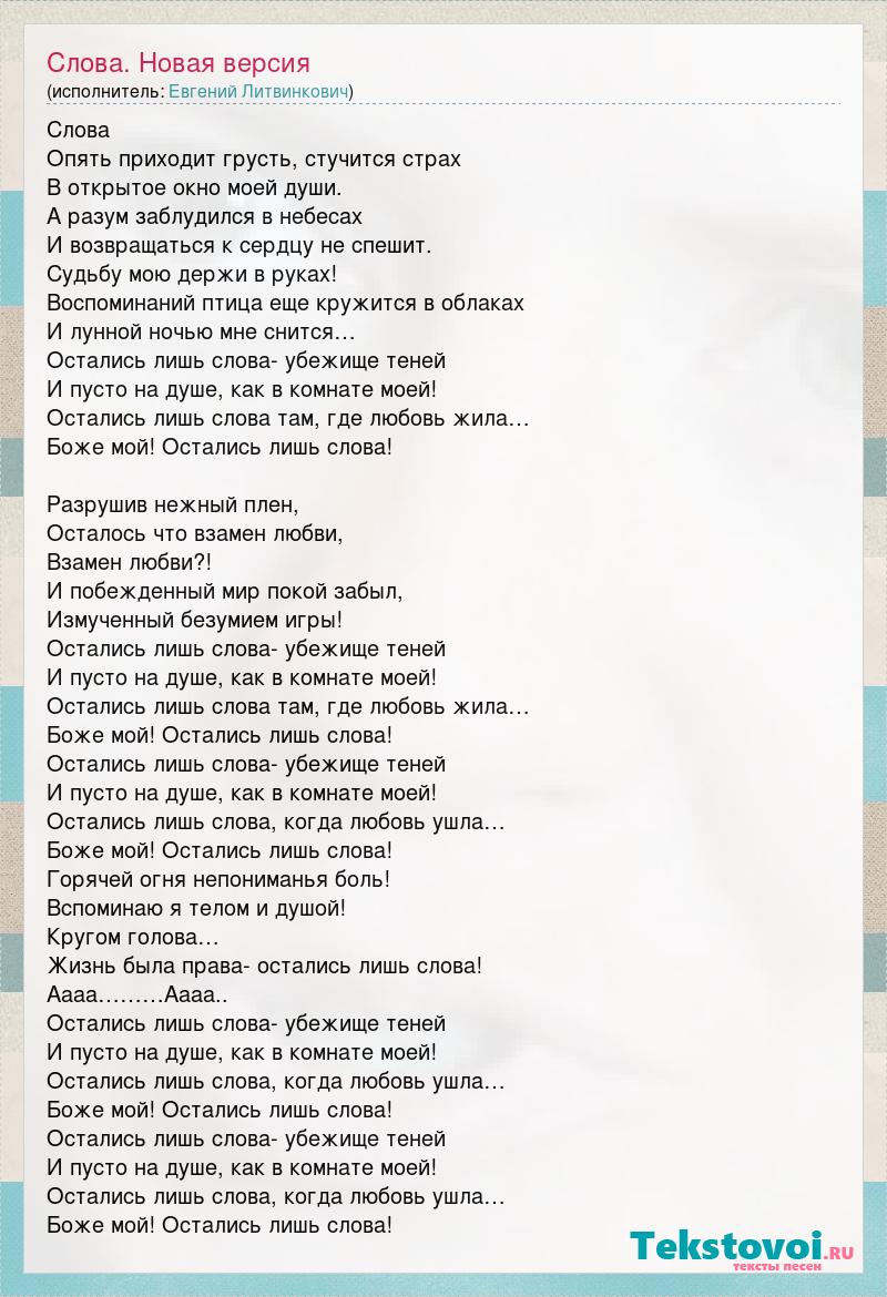 Слова Опять приходит грусть, стучится страх В открытое окно моей души. А разум заблудился в небесах И возвращаться к сердцу не спешит. Судьбу мою держи в руках! Воспоминаний птица еще кружится в облаках И лунной ночью мне снится… Остались лишь слова- убежище теней И пусто на душе, как в комнате моей! Остались лишь слова там, где любовь жила… Боже мой! Остались лишь слова! Разрушив нежный плен, Осталось что взамен любви, Взамен любви?! И побежденный мир покой забыл, Измученный безумием игры! Остались лишь слова- убежище теней И пусто на душе, как в комнате моей! Остались лишь слова там, где любовь жила… Боже мой! Остались лишь слова! Остались лишь слова- убежище теней И пусто на душе, как в комнате моей! Остались лишь слова, когда любовь ушла… Боже мой! Остались лишь слова! Горячей огня непониманья боль! Вспоминаю я телом и душой! Кругом голова… Жизнь была права- остались лишь слова! Аааа………Аааа.. Остались лишь слова- убежище теней И пусто на душе, как в комнате моей! Остались лишь слова, когда любовь ушла… Боже мой! Остались лишь слова! Остались лишь слова- убежище теней И пусто на душе, как в комнате моей! Остались лишь слова, когда любовь ушла… Боже мой! Остались лишь слова!