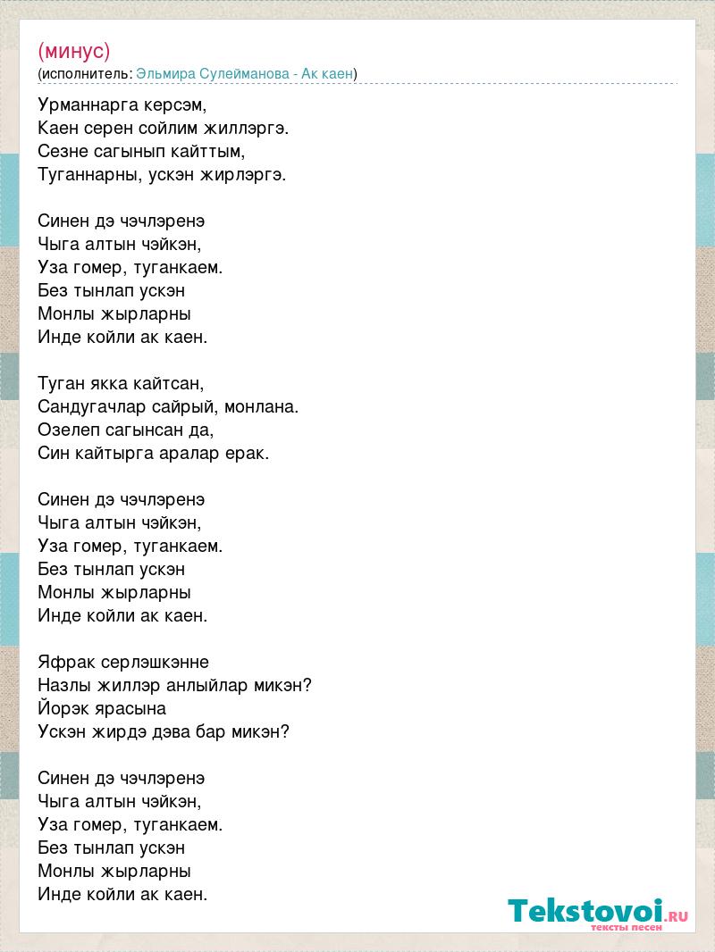 Урманнарга керсэм, Каен серен сойлим жиллэргэ. Сезне сагынып кайттым, Туганнарны, ускэн жирлэргэ. Синен дэ чэчлэренэ Чыга алтын чэйкэн, Уза гомер, туганкаем. Без тынлап ускэн Монлы жырларны Инде койли ак каен. Туган якка кайтсан, Сандугачлар сайрый, монлана. Озелеп сагынсан да, Син кайтырга аралар ерак. Синен дэ чэчлэренэ Чыга алтын чэйкэн, Уза гомер, туганкаем. Без тынлап ускэн Монлы жырларны Инде койли ак каен. Яфрак серлэшкэнне Назлы жиллэр анлыйлар микэн? Йорэк ярасына Ускэн жирдэ дэва бар микэн? Синен дэ чэчлэренэ Чыга алтын чэйкэн, Уза гомер, туганкаем. Без тынлап ускэн Монлы жырларны Инде койли ак каен.