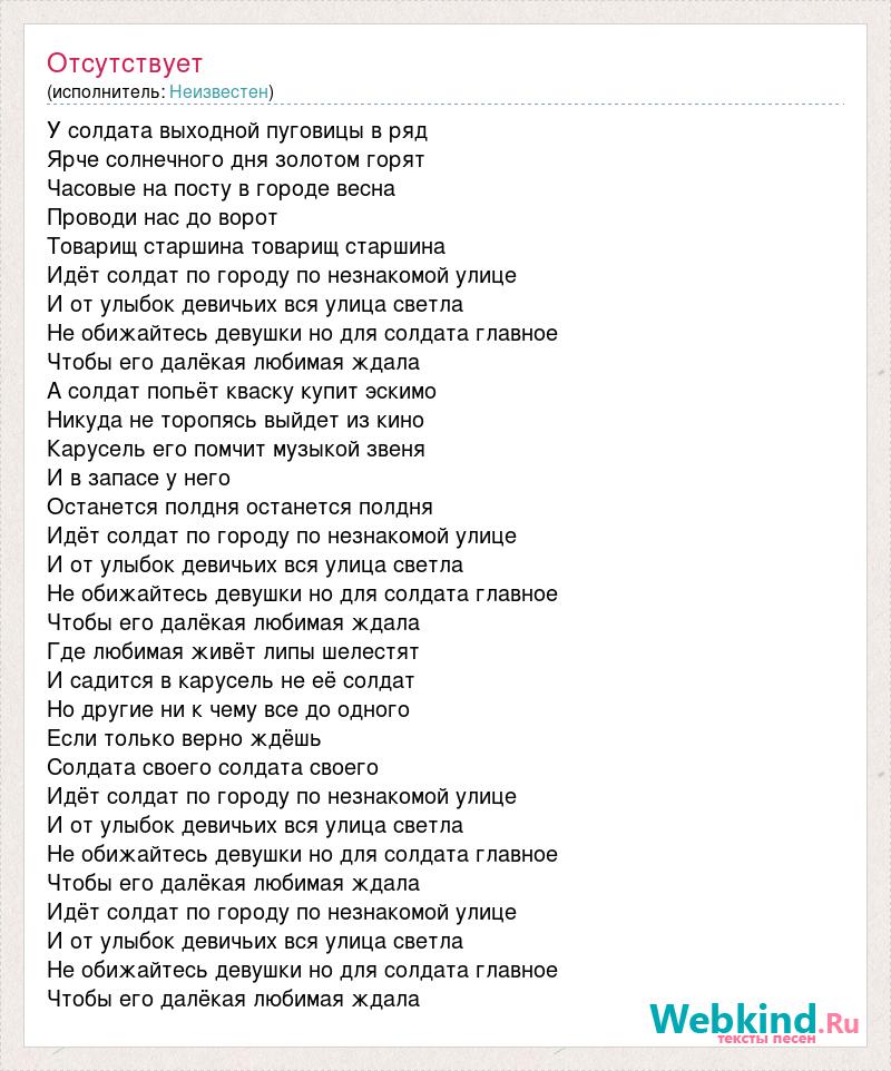 У солдата выходной пуговицы в ряд Ярче солнечного дня золотом горят Часовые на посту в городе весна Проводи нас до ворот Товарищ старшина товарищ старшина Идёт солдат по городу по незнакомой улице И от улыбок девичьих вся улица светла Не обижайтесь девушки но для солдата главное Чтобы его далёкая любимая ждала А солдат попьёт кваску купит эскимо Никуда не торопясь выйдет из кино Карусель его помчит музыкой звеня И в запасе у него Останется полдня останется полдня Идёт солдат по городу по незнакомой улице И от улыбок девичьих вся улица светла Не обижайтесь девушки но для солдата главное Чтобы его далёкая любимая ждала Где любимая живёт липы шелестят И садится в карусель не её солдат Но другие ни к чему все до одного Если только верно ждёшь Солдата своего солдата своего Идёт солдат по городу по незнакомой улице И от улыбок девичьих вся улица светла Не обижайтесь девушки но для солдата главное Чтобы его далёкая любимая ждала Идёт солдат по городу по незнакомой улице И от улыбок девичьих вся улица светла Не обижайтесь девушки но для солдата главное Чтобы его далёкая любимая ждала