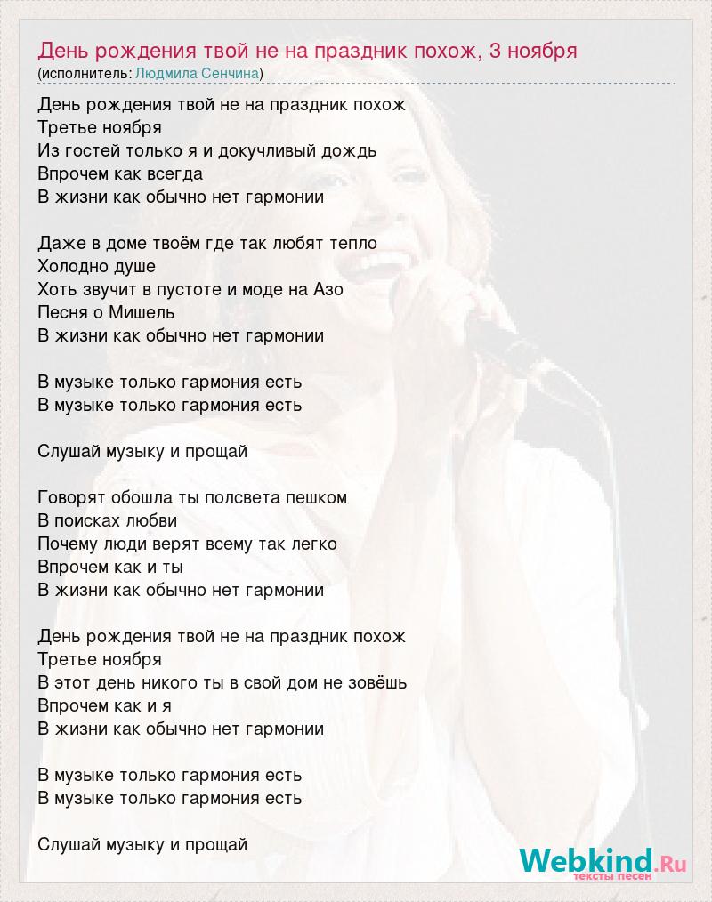 День рождения твой не на праздник похож Третье ноября Из гостей только я и докучливый дождь Впрочем как всегда В жизни как обычно нет гармонии Даже в доме твоём где так любят тепло Холодно душе Хоть звучит в пустоте и моде на Азо Песня о Мишель В жизни как обычно нет гармонии В музыке только гармония есть В музыке только гармония есть Слушай музыку и прощай Говорят обошла ты полсвета пешком В поисках любви Почему люди верят всему так легко Впрочем как и ты В жизни как обычно нет гармонии День рождения твой не на праздник похож Третье ноября В этот день никого ты в свой дом не зовёшь Впрочем как и я В жизни как обычно нет гармонии В музыке только гармония есть В музыке только гармония есть Слушай музыку и прощай