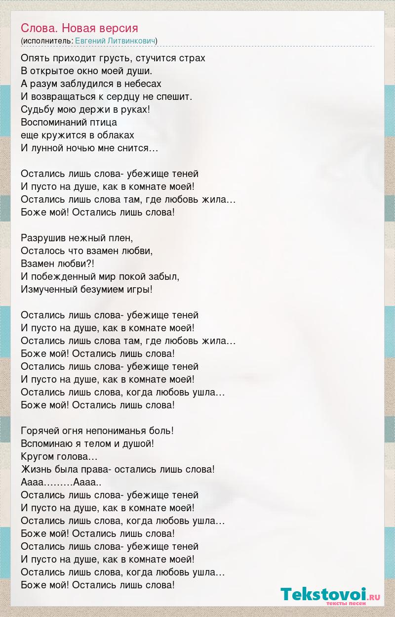 Опять приходит грусть, стучится страх В открытое окно моей души. А разум заблудился в небесах И возвращаться к сердцу не спешит. Судьбу мою держи в руках! Воспоминаний птица еще кружится в облаках И лунной ночью мне снится… Остались лишь слова- убежище теней И пусто на душе, как в комнате моей! Остались лишь слова там, где любовь жила… Боже мой! Остались лишь слова! Разрушив нежный плен, Осталось что взамен любви, Взамен любви?! И побежденный мир покой забыл, Измученный безумием игры! Остались лишь слова- убежище теней И пусто на душе, как в комнате моей! Остались лишь слова там, где любовь жила… Боже мой! Остались лишь слова! Остались лишь слова- убежище теней И пусто на душе, как в комнате моей! Остались лишь слова, когда любовь ушла… Боже мой! Остались лишь слова! Горячей огня непониманья боль! Вспоминаю я телом и душой! Кругом голова… Жизнь была права- остались лишь слова! Аааа………Аааа.. Остались лишь слова- убежище теней И пусто на душе, как в комнате моей! Остались лишь слова, когда любовь ушла… Боже мой! Остались лишь слова! Остались лишь слова- убежище теней И пусто на душе, как в комнате моей! Остались лишь слова, когда любовь ушла… Боже мой! Остались лишь слова!