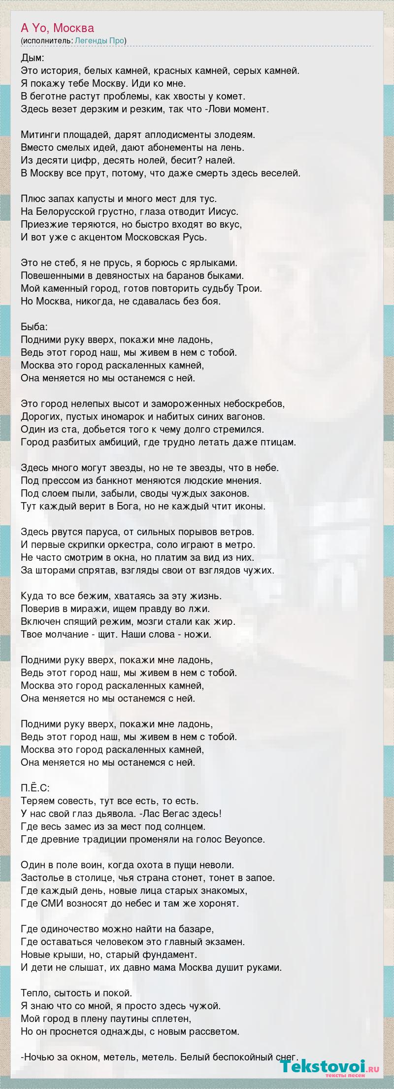 Дым: Это история, белых камней, красных камней, серых камней. Я покажу тебе Москву. Иди ко мне. В беготне растут проблемы, как хвосты у комет. Здесь везет дерзким и резким, так что -Лови момент. Митинги площадей, дарят аплодисменты злодеям. Вместо смелых идей, дают абонементы на лень. Из десяти цифр, десять нолей, бесит? налей. В Москву все прут, потому, что даже смерть здесь веселей. Плюс запах капусты и много мест для тус. На Белорусской грустно, глаза отводит Иисус. Приезжие теряются, но быстро входят во вкус, И вот уже с акцентом Московская Русь. Это не стеб, я не прусь, я борюсь с ярлыками. Повешенными в девяностых на баранов быками. Мой каменный город, готов повторить судьбу Трои. Но Москва, никогда, не сдавалась без боя. Быба: Подними руку вверх, покажи мне ладонь, Ведь этот город наш, мы живем в нем с тобой. Москва это город раскаленных камней, Она меняется но мы останемся с ней. Это город нелепых высот и замороженных небоскребов, Дорогих, пустых иномарок и набитых синих вагонов. Один из ста, добьется того к чему долго стремился. Город разбитых амбиций, где трудно летать даже птицам. Здесь много могут звезды, но не те звезды, что в небе. Под прессом из банкнот меняются людские мнения. Под слоем пыли, забыли, своды чуждых законов. Тут каждый верит в Бога, но не каждый чтит иконы. Здесь рвутся паруса, от сильных порывов ветров. И первые скрипки оркестра, соло играют в метро. Не часто смотрим в окна, но платим за вид из них. За шторами спрятав, взгляды свои от взглядов чужих. Куда то все бежим, хватаясь за эту жизнь. Поверив в миражи, ищем правду во лжи. Включен спящий режим, мозги стали как жир. Твое молчание - щит. Наши слова - ножи. Подними руку вверх, покажи мне ладонь, Ведь этот город наш, мы живем в нем с тобой. Москва это город раскаленных камней, Она меняется но мы останемся с ней. Подними руку вверх, покажи мне ладонь, Ведь этот город наш, мы живем в нем с тобой. Москва это город раскаленных камней, Она меняется но мы останемся с ней. П.Ё.С: Теряем совесть, тут все есть, то есть. У нас свой глаз дьявола. -Лас Вегас здесь! Где весь замес из за мест под солнцем. Где древние традиции променяли на голос Beyonce. Один в поле воин, когда охота в пущи неволи. Застолье в столице, чья страна стонет, тонет в запое. Где каждый день, новые лица старых знакомых, Где СМИ возносят до небес и там же хоронят. Где одиночество можно найти на базаре, Где оставаться человеком это главный экзамен. Новые крыши, но, старый фундамент. И дети не слышат, их давно мама Москва душит руками. Тепло, сытость и покой. Я знаю что со мной, я просто здесь чужой. Мой город в плену паутины сплетен, Но он проснется однажды, с новым рассветом. -Ночью за окном, метель, метель. Белый беспокойный снег.