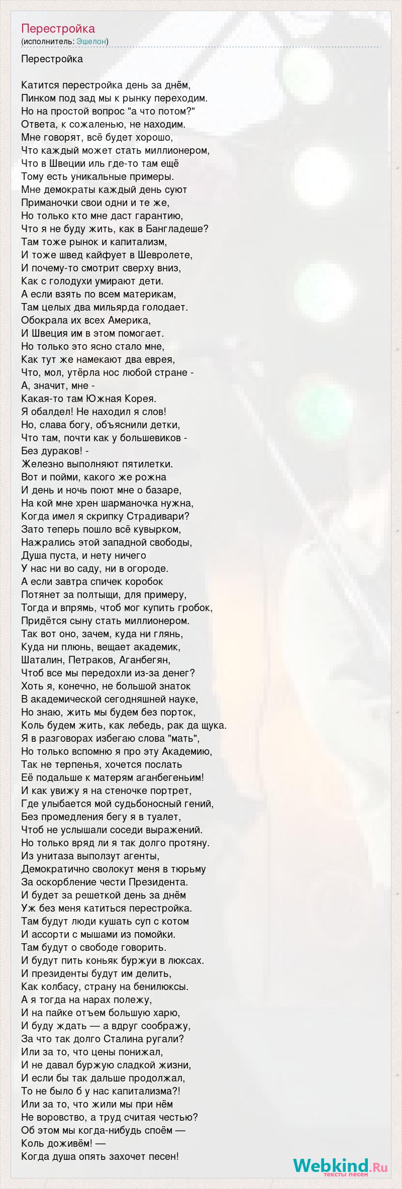 Перестройка Катится перестройка день за днём, Пинком под зад мы к рынку переходим. Но на простой вопрос "а что потом?" Ответа, к сожаленью, не находим. Мне говорят, всё будет хорошо, Что каждый может стать миллионером, Что в Швеции иль где-то там ещё Тому есть уникальные примеры. Мне демократы каждый день суют Приманочки свои одни и те же, Но только кто мне даст гарантию, Что я не буду жить, как в Бангладеше? Там тоже рынок и капитализм, И тоже швед кайфует в Шевролете, И почему-то смотрит сверху вниз, Как с голодухи умирают дети. А если взять по всем материкам, Там целых два мильярда голодает. Обокрала их всех Америка, И Швеция им в этом помогает. Но только это ясно стало мне, Как тут же намекают два еврея, Что, мол, утёрла нос любой стране - А, значит, мне - Какая-то там Южная Корея. Я обалдел! Не находил я слов! Но, слава богу, объяснили детки, Что там, почти как у большевиков - Без дураков! - Железно выполняют пятилетки. Вот и пойми, какого же рожна И день и ночь поют мне о базаре, На кой мне хрен шарманочка нужна, Когда имел я скрипку Страдивари? Зато теперь пошло всё кувырком, Нажрались этой западной свободы, Душа пуста, и нету ничего У нас ни во саду, ни в огороде. А если завтра спичек коробок Потянет за полтыщи, для примеру, Тогда и впрямь, чтоб мог купить гробок, Придётся сыну стать миллионером. Так вот оно, зачем, куда ни глянь, Куда ни плюнь, вещает академик, Шаталин, Петраков, Аганбегян, Чтоб все мы передохли из-за денег? Хоть я, конечно, не большой знаток В академической сегодняшней науке, Но знаю, жить мы будем без порток, Коль будем жить, как лебедь, рак да щука. Я в разговорах избегаю слова "мать", Но только вспомню я про эту Академию, Так не терпенья, хочется послать Её подальше к матерям аганбегеньим! И как увижу я на стеночке портрет, Где улыбается мой судьбоносный гений, Без промедления бегу я в туалет, Чтоб не услышали соседи выражений. Но только вряд ли я так долго протяну. Из унитаза выползут агенты, Демократично сволокут меня в тюрьму За оскорбление чести Президента. И будет за решеткой день за днём Уж без меня катиться перестройка. Там будут люди кушать суп с котом И ассорти с мышами из помойки. Там будут о свободе говорить. И будут пить коньяк буржуи в люксах. И президенты будут им делить, Как колбасу, страну на бенилюксы. А я тогда на нарах полежу, И на пайке отъем большую харю, И буду ждать — а вдруг соображу, За что так долго Сталина ругали? Или за то, что цены понижал, И не давал буржую сладкой жизни, И если бы так дальше продолжал, То не было б у нас капитализма?! Или за то, что жили мы при нём Не воровство, а труд считая честью? Об этом мы когда-нибудь споём — Коль доживём! — Когда душа опять захочет песен!