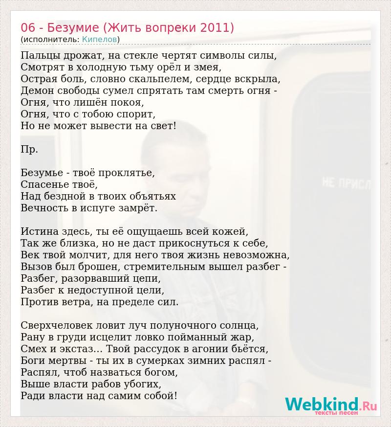 Пальцы дрожат, на стекле чертят символы силы, Смотрят в холодную тьму орёл и змея, Острая боль, словно скальпелем, сердце вскрыла, Демон свободы сумел спрятать там смерть огня - Огня, что лишён покоя, Огня, что с тобою спорит, Но не может вывести на свет! Пр. Безумье - твоё проклятье, Спасенье твоё, Над бездной в твоих объятьях Вечность в испуге замрёт. Истина здесь, ты её ощущаешь всей кожей, Так же близка, но не даст прикоснуться к себе, Век твой молчит, для него твоя жизнь невозможна, Вызов был брошен, стремительным вышел разбег - Разбег, разорвавший цепи, Разбег к недоступной цели, Против ветра, на пределе сил. Сверхчеловек ловит луч полуночного солнца, Рану в груди исцелит ловко пойманный жар, Смех и экстаз… Твой рассудок в агонии бьётся, Боги мертвы - ты их в сумерках зимних распял - Распял, чтоб назваться богом, Выше власти рабов убогих, Ради власти над самим собой!