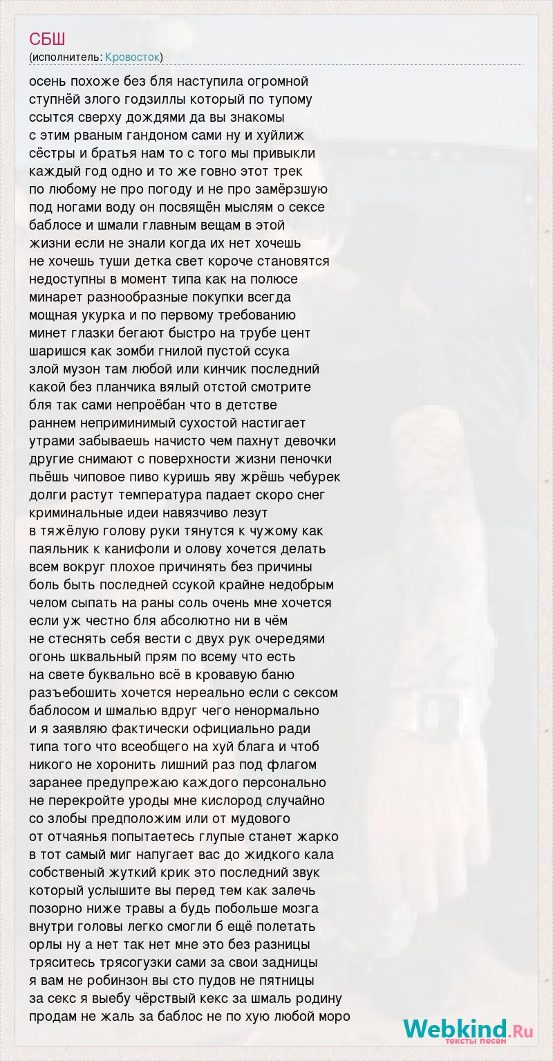 осень похоже без бля наступила огромной ступнёй злого годзиллы который по тупому ссытся сверху дождями да вы знакомы с этим рваным гандоном сами ну и хуйлиж сёстры и братья нам то с того мы привыкли каждый год одно и то же говно этот трек по любому не про погоду и не про замёрзшую под ногами воду он посвящён мыслям о сексе баблосе и шмали главным вещам в этой жизни если не знали когда их нет хочешь не хочешь туши детка свет короче становятся недоступны в момент типа как на полюсе минарет разнообразные покупки всегда мощная укурка и по первому требованию минет глазки бегают быстро на трубе цент шаришся как зомби гнилой пустой ссука злой музон там любой или кинчик последний какой без планчика вялый отстой смотрите бля так сами непроёбан что в детстве раннем неприминимый сухостой настигает утрами забываешь начисто чем пахнут девочки другие снимают с поверхности жизни пеночки пьёшь чиповое пиво куришь яву жрёшь чебурек долги растут температура падает скоро снег криминальные идеи навязчиво лезут в тяжёлую голову руки тянутся к чужому как паяльник к канифоли и олову хочется делать всем вокруг плохое причинять без причины боль быть последней ссукой крайне недобрым челом сыпать на раны соль очень мне хочется если уж честно бля абсолютно ни в чём не стеснять себя вести с двух рук очередями огонь шквальный прям по всему что есть на свете буквально всё в кровавую баню разъебошить хочется нереально если с сексом баблосом и шмалью вдруг чего ненормально и я заявляю фактически официально ради типа того что всеобщего на хуй блага и чтоб никого не хоронить лишний раз под флагом заранее предупрежаю каждого персонально не перекройте уроды мне кислород случайно со злобы предположим или от мудового от отчаянья попытаетесь глупые станет жарко в тот самый миг напугает вас до жидкого кала собственый жуткий крик это последний звук который услышите вы перед тем как залечь позорно ниже травы а будь побольше мозга внутри головы легко смогли б ещё полетать орлы ну а нет так нет мне это без разницы тряситесь трясогузки сами за свои задницы я вам не робинзон вы сто пудов не пятницы за секс я выебу чёрствый кекс за шмаль родину продам не жаль за баблос не по хую любой моро