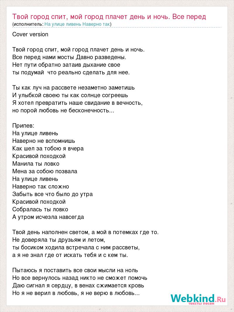 Cover version Твой город спит, мой город плачет день и ночь. Все перед нами мосты Давно разведены. Нет пути обратно затаив дыхание свое ты подумай что реально сделать для нее. Ты как луч на рассвете незаметно заметишь И улыбкой своею ты как солнце согреешь Я хотел превратить наше свидание в вечность, но порой любовь не бесконечность... Припев: На улице ливень Наверно не вспомнишь Как шел за тобою я вчера Красивой походкой Манила ты ловко Мена за собою позвала На улице ливень Наверно так сложно Забыть все что было до утра Красивой походкой Собралась ты ловко А утром исчезла навсегда Твой день наполнен светом, а мой в потемках где то. Не доверяла ты друзьям и летом, ты босиком ходила встречала с ним рассветы, а я не знал где от искать тебя и с кем ты. Пытаюсь я поставить все свои мысли на ноль Но все вернулось назад никто не сможет помочь Даю сигнал я сердцу, в венах сжимается кровь Но я не верил в любовь, я не верю в любовь...