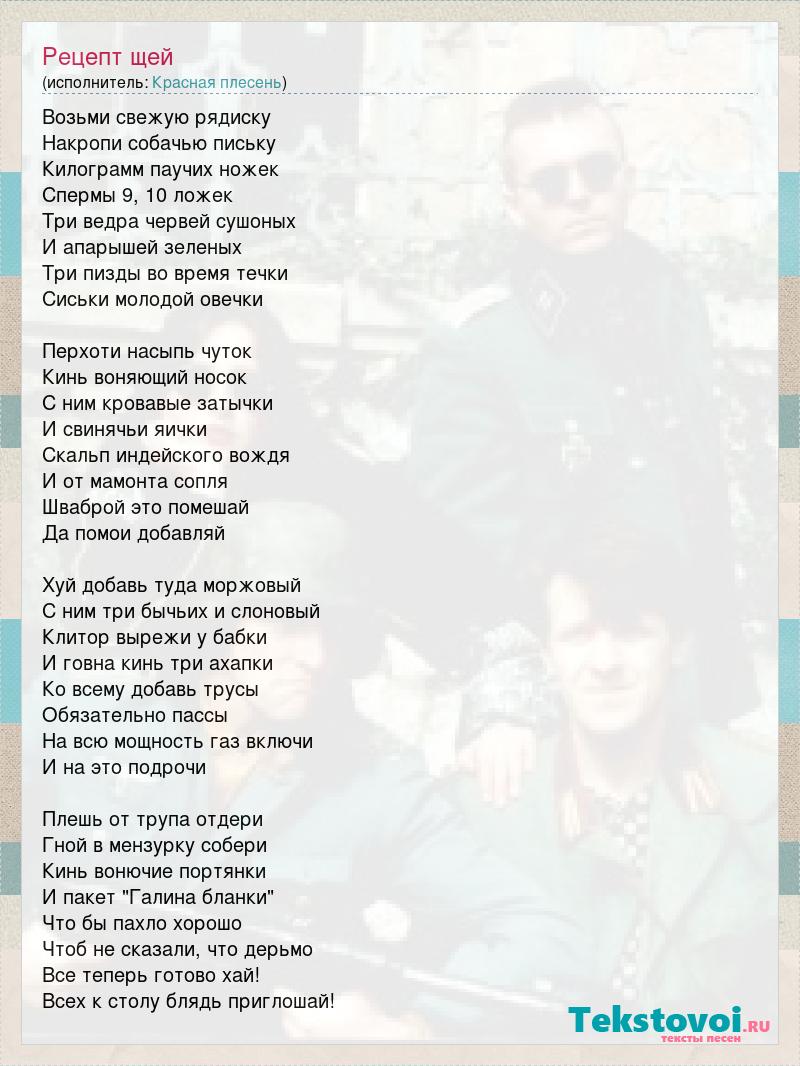 Возьми свежую рядиску Накропи собачью письку Килограмм паучих ножек Спермы 9, 10 ложек Три ведра червей сушоных И апарышей зеленых Три пизды во время течки Сиськи молодой овечки Перхоти насыпь чуток Кинь воняющий носок С ним кровавые затычки И свинячьи яички Скальп индейского вождя И от мамонта сопля Шваброй это помешай Да помои добавляй Хуй добавь туда моржовый С ним три бычьих и слоновый Клитор вырежи у бабки И говна кинь три ахапки Ко всему добавь трусы Обязательно пассы На всю мощность газ включи И на это подрочи Плешь от трупа отдери Гной в мензурку собери Кинь вонючие портянки И пакет "Галина бланки" Что бы пахло хорошо Чтоб не сказали, что дерьмо Все теперь готово хай! Всех к столу блядь приглошай!