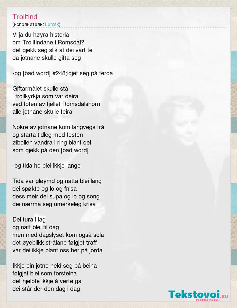 Vilja du høyra historia om Trolltindane i Romsdal? det gjekk seg slik at dei vart te' da jotnane skulle gifta seg -og [bad word] #248;lgjet seg på ferda Giftarmålet skulle stå i trollkyrkja som var deira ved foten av fjellet Romsdalshorn alle jotnane skulle feira Nokre av jotnane kom langvegs frå og starta tidleg med festen ølbollen vandra i ring blant dei som gjekk på den [bad word] -og tida ho blei ikkje lange Tida var gløymd og natta blei lang dei spøkte og lo og fnisa dess meir dei supa og lo og song dei nærma seg umerkeleg krisa Dei tura i lag og natt blei til dag men med dagslyset kom også sola det øyeblikk strålane følgjet traff var dei ikkje blant oss her på jorda Ikkje ein jotne held seg på beina følgjet blei som forsteina det hjelpte ikkje å verte gal dei står der den dag i dag