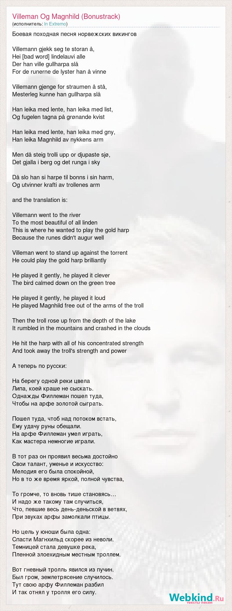 Боевая походная песня норвежских викингов Villemann gjekk seg te storan å, Hei [bad word] lindelauvi alle Der han ville gullharpa slå For de runerne de lyster han å vinne Villemann gjenge for straumen å stå, Mesterleg kunne han gullharpa slå Han leika med lente, han leika med list, Og fugelen tagna på grønande kvist Han leika med lente, han leika med gny, Han leika Magnhild av nykkens arm Men då steig trolli upp or djupaste sjø, Det gjalla i berg og det runga i sky Då slo han si harpe til bonns i sin harm, Og utvinner krafti av trollenes arm and the translation is: Villemann went to the river To the most beautiful of all linden This is where he wanted to play the gold harp Because the runes didn't augur well Villeman went to stand up against the torrent He could play the gold harp brilliantly He played it gently, he played it clever The bird calmed down on the green tree He played it gently, he played it loud He played Magnhild free out of the arms of the troll Then the troll rose up from the depth of the lake It rumbled in the mountains and crashed in the clouds He hit the harp with all of his concentrated strength And took away the troll's strength and power А теперь по русски: На берегу одной реки цвела Липа, коей краше не сыскать. Однажды Филлеман пошел туда, Чтобы на арфе золотой сыграть. Пошел туда, чтоб над потоком встать, Ему удачу руны обещали. На арфе Филлеман умел играть, Как мастера немногие играли. В тот раз он проявил весьма достойно Свои талант, уменье и искусство: Мелодия его была спокойной, Но в то же время яркой, полной чувства, То громче, то вновь тише становясь… И надо же такому там случиться, Что, певшие весь день-деньской в ветвях, При звуках арфы замолкали птицы. Но цель у юноши была одна: Спасти Магнхильд скорее из неволи. Темницей стала девушке река, Пленной злоехидным местным троллем. Вот гневный тролль явился из пучин. Был гром, землетрясение случилось. Тут свою арфу Филлеман разбил И так отнял у тролля его силу.