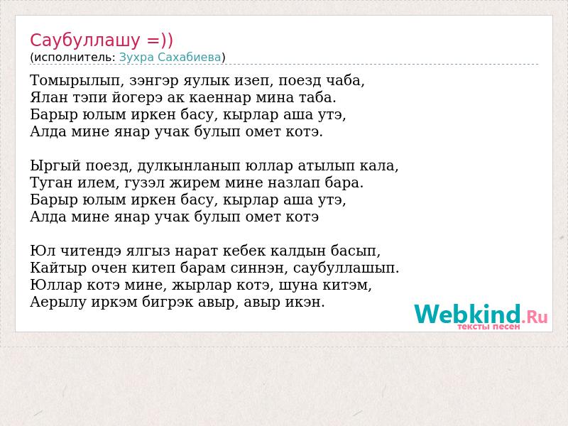 Томырылып, зэнгэр яулык изеп, поезд чаба, Ялан тэпи йогерэ ак каеннар мина таба. Барыр юлым иркен басу, кырлар аша утэ, Алда мине янар учак булып омет котэ. Ыргый поезд, дулкынланып юллар атылып кала, Туган илем, гузэл жирем мине назлап бара. Барыр юлым иркен басу, кырлар аша утэ, Алда мине янар учак булып омет котэ Юл читендэ ялгыз нарат кебек калдын басып, Кайтыр очен китеп барам синнэн, саубуллашып. Юллар котэ мине, жырлар котэ, шуна китэм, Аерылу иркэм бигрэк авыр, авыр икэн.
