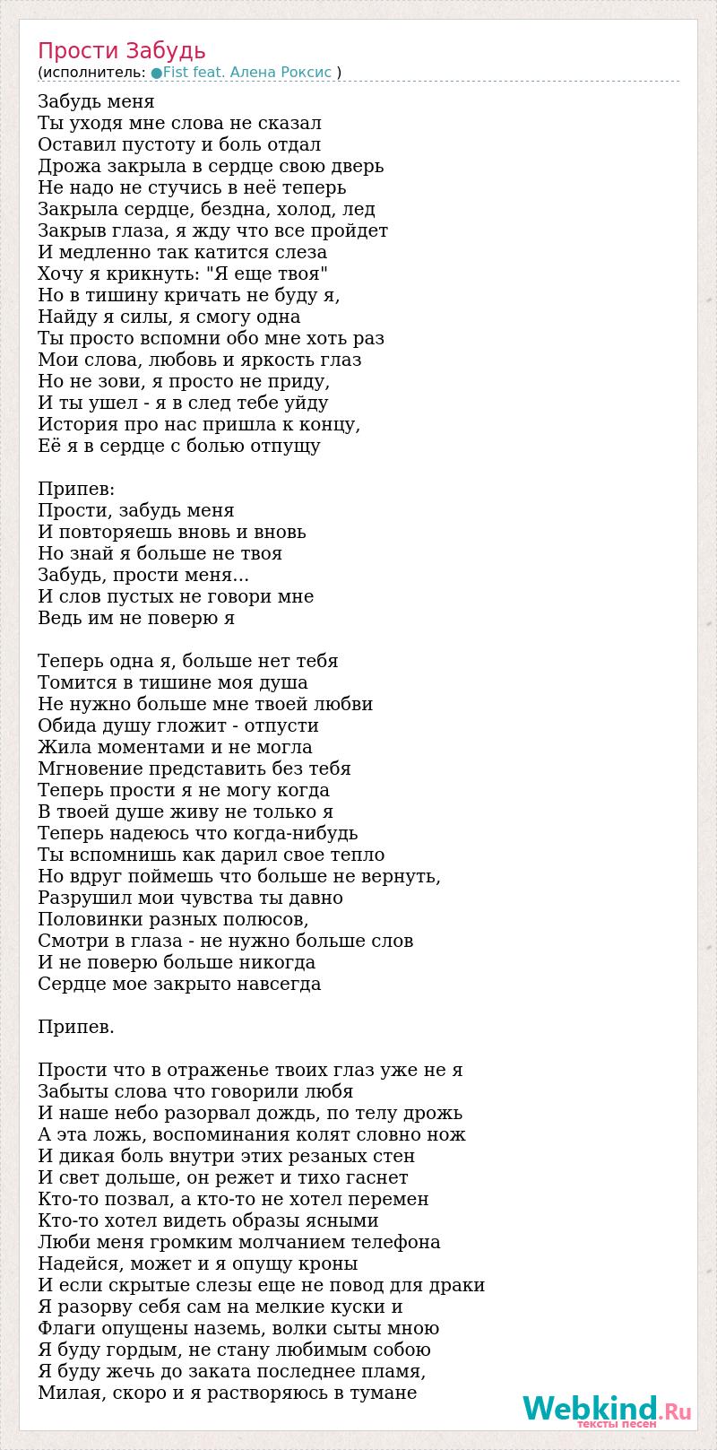 Забудь меня Ты уходя мне слова не сказал Оставил пустоту и боль отдал Дрожа закрыла в сердце свою дверь Не надо не стучись в неё теперь Закрыла сердце, бездна, холод, лед Закрыв глаза, я жду что все пройдет И медленно так катится слеза Хочу я крикнуть: "Я еще твоя" Но в тишину кричать не буду я, Найду я силы, я смогу одна Ты просто вспомни обо мне хоть раз Мои слова, любовь и яркость глаз Но не зови, я просто не приду, И ты ушел - я в след тебе уйду История про нас пришла к концу, Её я в сердце с болью отпущу Припев: Прости, забудь меня И повторяешь вновь и вновь Но знай я больше не твоя Забудь, прости меня... И слов пустых не говори мне Ведь им не поверю я Теперь одна я, больше нет тебя Томится в тишине моя душа Не нужно больше мне твоей любви Обида душу гложит - отпусти Жила моментами и не могла Мгновение представить без тебя Теперь прости я не могу когда В твоей душе живу не только я Теперь надеюсь что когда-нибудь Ты вспомнишь как дарил свое тепло Но вдруг поймешь что больше не вернуть, Разрушил мои чувства ты давно Половинки разных полюсов, Смотри в глаза - не нужно больше слов И не поверю больше никогда Сердце мое закрыто навсегда Припев. Прости что в отраженье твоих глаз уже не я Забыты слова что говорили любя И наше небо разорвал дождь, по телу дрожь А эта ложь, воспоминания колят словно нож И дикая боль внутри этих резаных стен И свет дольше, он режет и тихо гаснет Кто-то позвал, а кто-то не хотел перемен Кто-то хотел видеть образы ясными Люби меня громким молчанием телефона Надейся, может и я опущу кроны И если скрытые слезы еще не повод для драки Я разорву себя сам на мелкие куски и Флаги опущены наземь, волки сыты мною Я буду гордым, не стану любимым собою Я буду жечь до заката последнее пламя, Милая, скоро и я растворяюсь в тумане