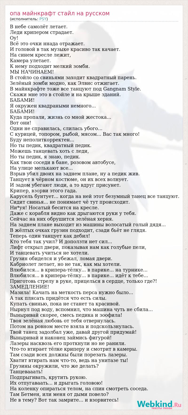 В небе самолёт летает. Леди крипером страдает. Оу! Всё это очки ннада отражает. И головой в так музыке красиво так качает. На синем кресле лежит, Камера улетает. К нему подходит мелкий зомби. МЫ НАЧИНАЕМ! В стойло со свиньями заходит квадратный парень. Зелёный зомби модно, как Элвис отжигает. В майнкрафте тоже все танцуют под Gangnam Style. Скажи мне это в стойле и на крыше зданий. БАБАМИ! Я окружен квадраными немного... БАБАМИ! Куда пропали, жизнь со мной жестока... Вот они! Одни не справилась, слилась убого... С курицей, топором, рыбой, мясом... Вас так много! Буду неполиткорректен... Но ты педик, квадратный педик. Можешь танцевать хоть с леди, Но ты педик, я знаю, педик. Как твои соседи в бане, розовом автобусе, На улице мелькают все... Взрыв убил двоих на заднем плане, ну а педик жив. Танцует в чёрном костюме, он их всех волнует. И задом убегают люди, а то вдруг присунет. Крипер, взорви этого гада. Карусель бунтует... когда на ней этот безумный танец все танцуют. Сидит свинья... не понимает чё тут происходит. Ни*уя! Носатый бесится на кресле. Даже с корабля видно как дрыгаются руки у тебя. Сейчас на них обрушится зелёная херня. На заднем плане выходит из машины волосатый голый дядя... В жёлтых очках грузин подходит, сзади бьёт не глядя. Теперь один танцует как дебил! Кто тебя так учил? И доползти нет сил... Лифт открыл двери, показывая нам как голубые пели, И танцевать учиться не хотели. Грузин обиделся и убежал, ломая двери. Кабриолет летает, но не так, как мы хотели. Влюбился... в крипера-тёлку... в парике... на турнике... Влюбился... в крипера-тёлку... в парике... идёт к тебе... Приготовь стрелу в руке, прицелься в сердце, только где?! ЗАМЕДЛЕНИЕ! Мазила! Качать на меткость перса нужно было... А так плясать придётся что есть силы. Купать свинью, пока не станет та красивой. Нырнул под воду, вспомнил, что машина чуть не сбила... Выныривай скорее, смесь педика и зоофила! Твоя зелёная любовь от тебя отвернулась. Потом на ровном месте взяла и подскользнулась. Твой танец задолбал уже, давай другой придумай! Выныривай и наконец займись фигурой! Лазеры насквозь его проткнули но не ранили. Что-то втирает тёлке криперу и смотрит в камеры. Там сзади всех должны были порезать лазеры. Хватит втирать нам что-то, ведь на унитазе ты! Грузины окружили, что же делать? Танцевааать! Подпрыгивать, крутить рукою. Их отпугаваать... и дрыгать головою! На коленку опираться телом, на спин смотреть соседа. Там Бетмен, или меня от дыми повело? Не в тему? Вот так замрите... и взорвитесь!